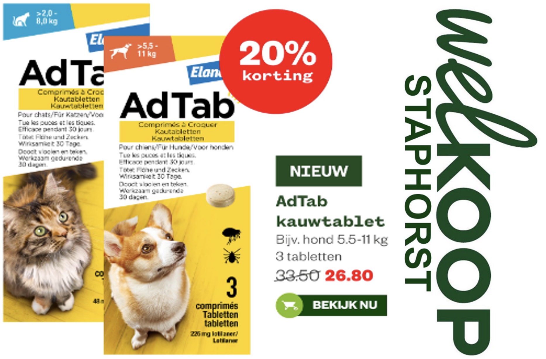 AdTab is een kauwtablet met vleessmaak voor honden en katten. Doodt vlooien en teken snel en is een maand lang werkzaam.