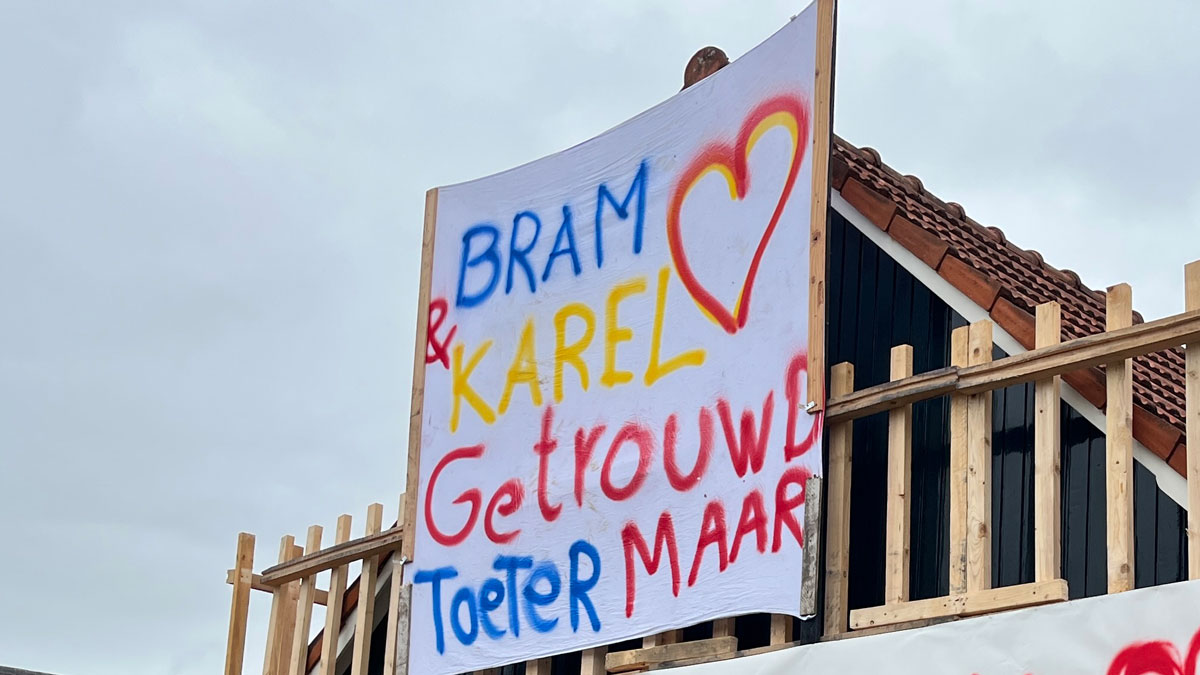 Aan de Oude Rijksweg in Staphorst, ook wel de Diek genoemd, staat een bijzondere tekst op een woning. (zie foto). Tevens een geïmproviseerde kippenren voor het kersverse bruidspaar.