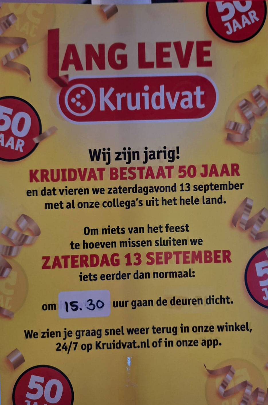 Kruidvat Staphorst sluit op zaterdag 13 september iets eerder dan normaal i.v.m. het jubileumfeest van Kruidvat.