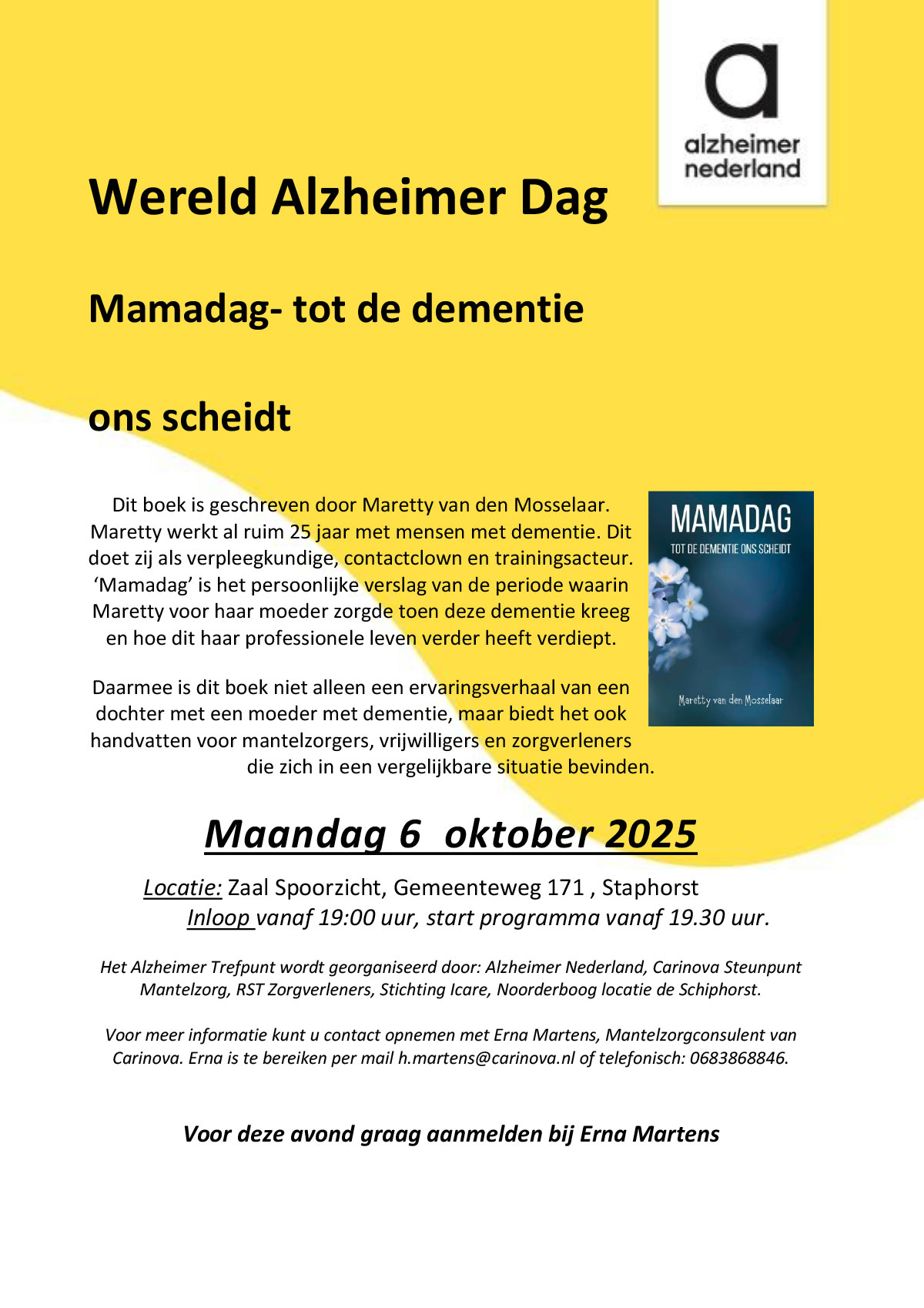 Wereld Alzheimer Dag: ‘Mamadag- tot de dementie ons scheidt’ in Zaal Spoorzicht