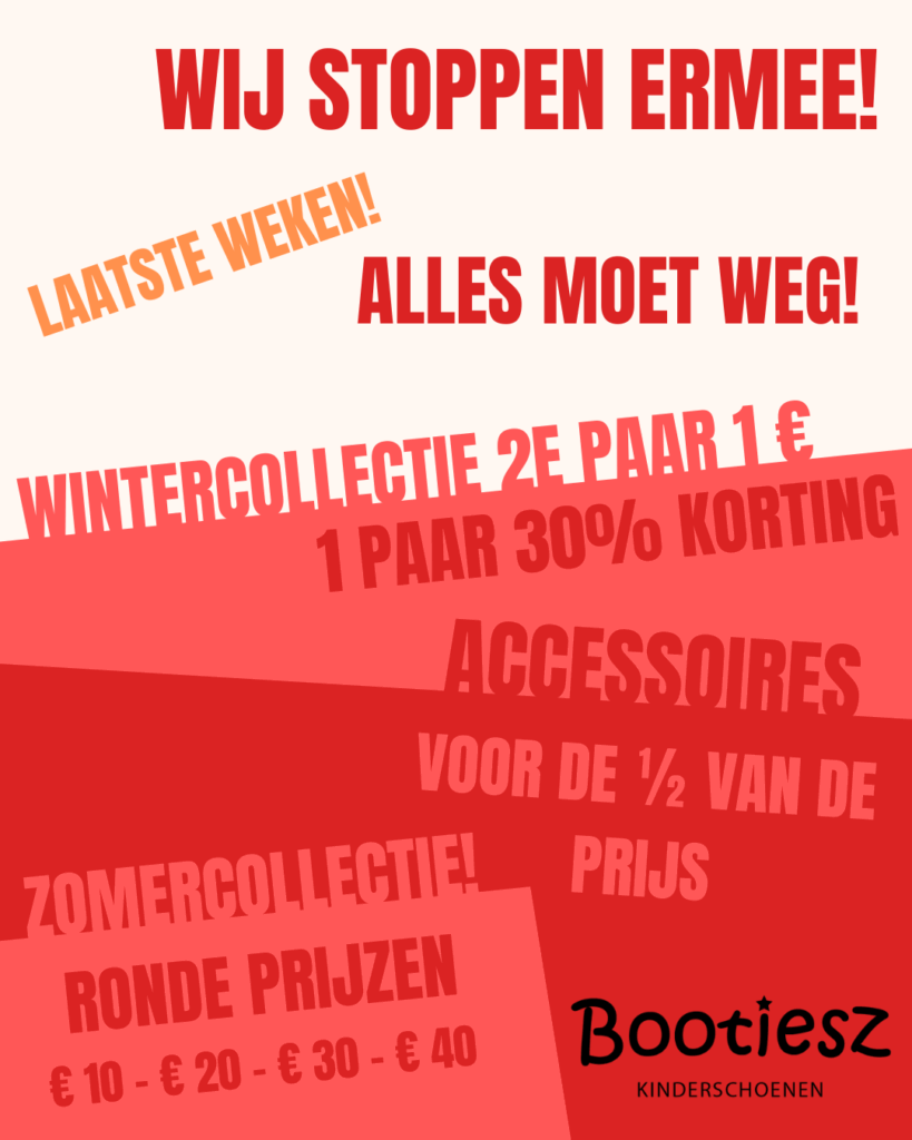 Wij stoppen ermee alles moet weg! – Bootiesz Kinderschoenen