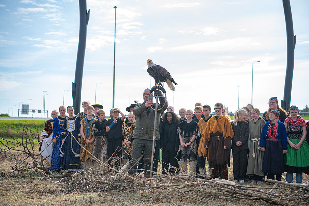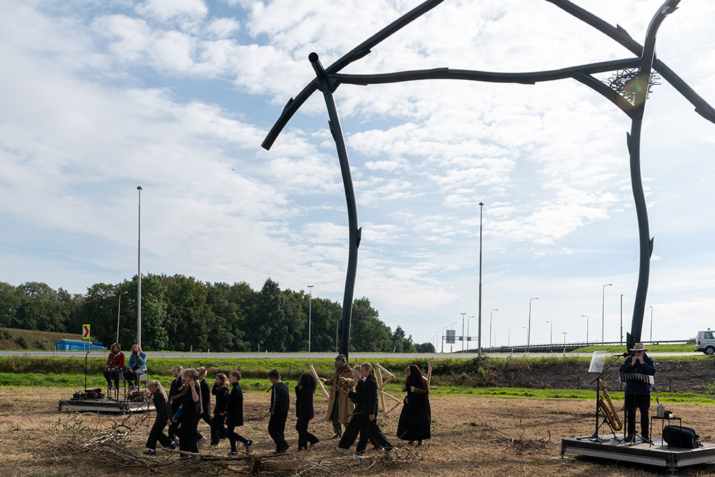 Staphorst, Lankhorst en IJhorst. Het zijn drie dorpen in de buurt, allemaal eindigend op horst. Daarom vond kunstenaar André Pielage het wel passend om een horst als kunstwerk neer te zetten. “Een horst is een hoger gelegen gebied in een moerassige omgeving. In deze hoger gelegen gebieden ontstonden de eerste nederzettingen. De dorpen hier in de buurt met horst in de naam zijn dus allemaal vernoemd naar die hoger gelegen gebieden. Dit was vroeger ook zo’n hoger gelegen gebied in een moeras. Het was een delta van de Zuiderzee”, legt Pielage uit. Overigens worden nesten van roofvogel ook wel horsten genoemd. Want die eerste nederzettingen werden omringd door een muur van takken. “Dat leek op een soort uitvergroot roofvogelnest. Dus het is niet toevallig dat een roofvogelnest ook horst wordt genoemd.”