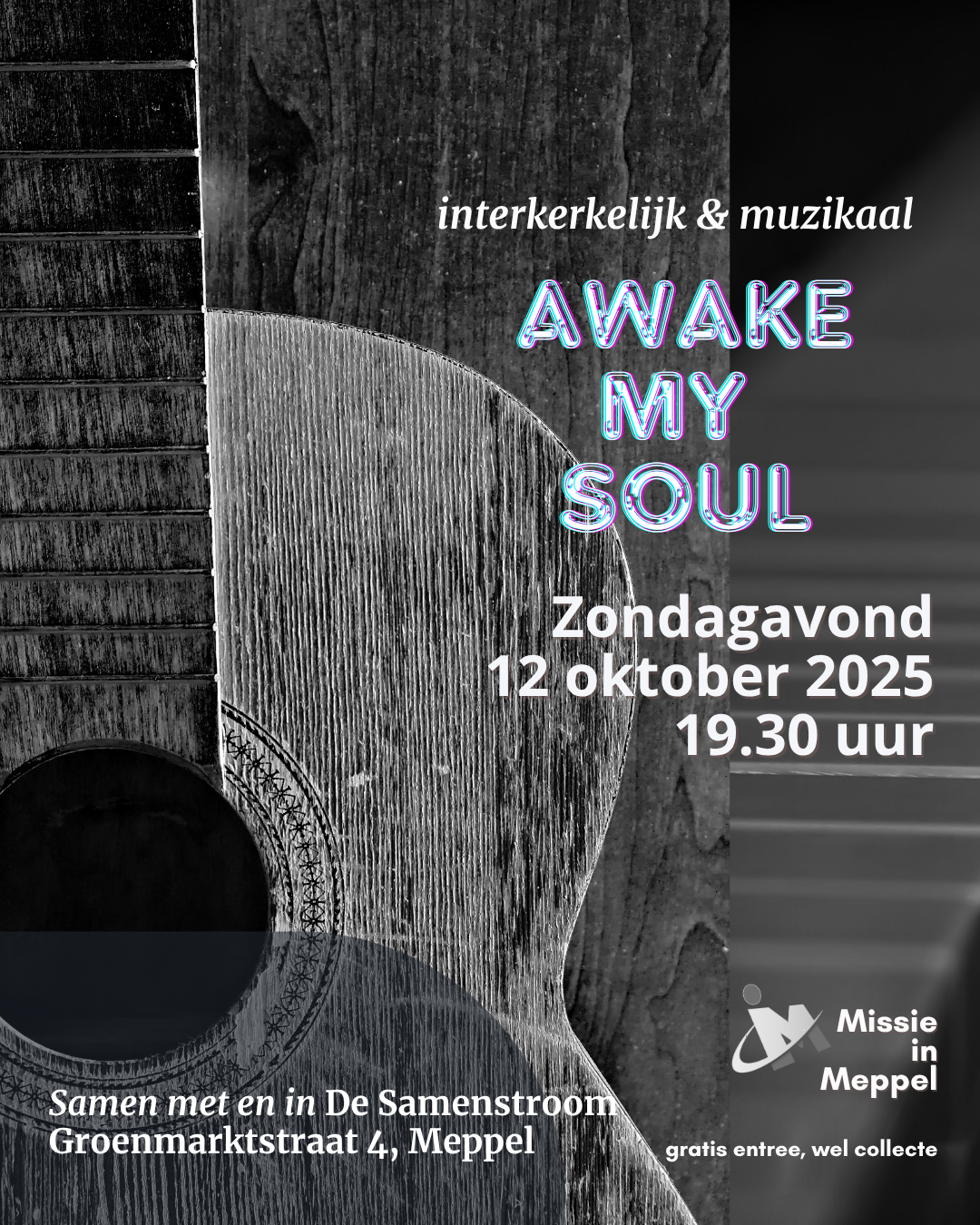 Op zondagavond 12 oktober om 19:30 uur klinkt in De Samenstroom opnieuw de uitnodiging: Awake My Soul. Deze bijzondere avond, inmiddels een vaste waarde in het seizoensprogramma van PG Meppel wordt gehouden en wordt muzikaal begeleid door een interkerkelijk samengestelde band via Missie in Meppel.