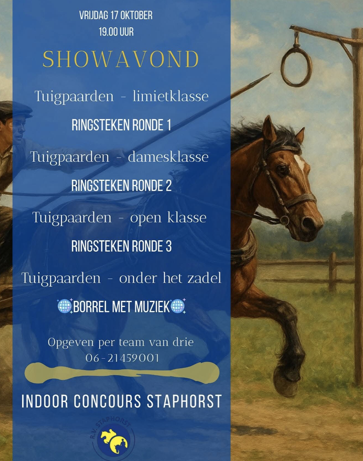Rijvereniging Staphorst organiseert op vrijdag 17 oktober een showavond vol actie, gezelligheid en spektakel! Vanaf 19.00 uur is iedereen welkom in de manege aan de Schuthekkeweg om te genieten van een afwisselend programma met tuigpaarden in diverse klassen en het altijd spannende ringsteken door teams.