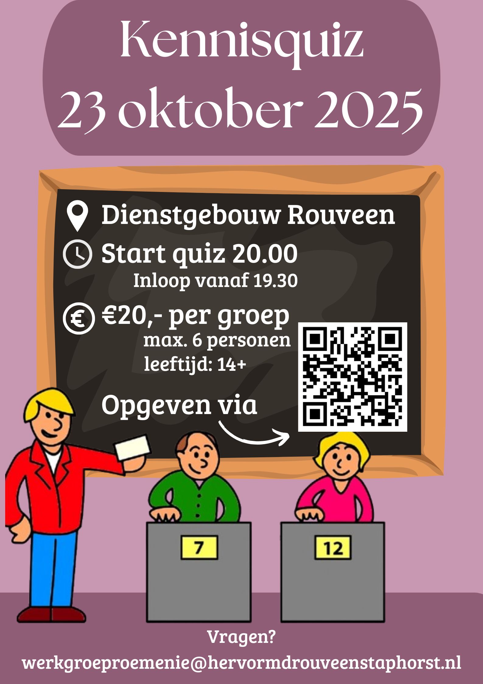 Wie kroont zich tot de slimste groep van de avond? Op D.V. donderdag 23 oktober 2025 houden we een kennisquiz in het dienstgebouw te Rouveen. Er komen meerdere rondes aan bod, van dorp tot geschiedenis, van religie tot hobby, voor ieder stukje kennis wat wils.
