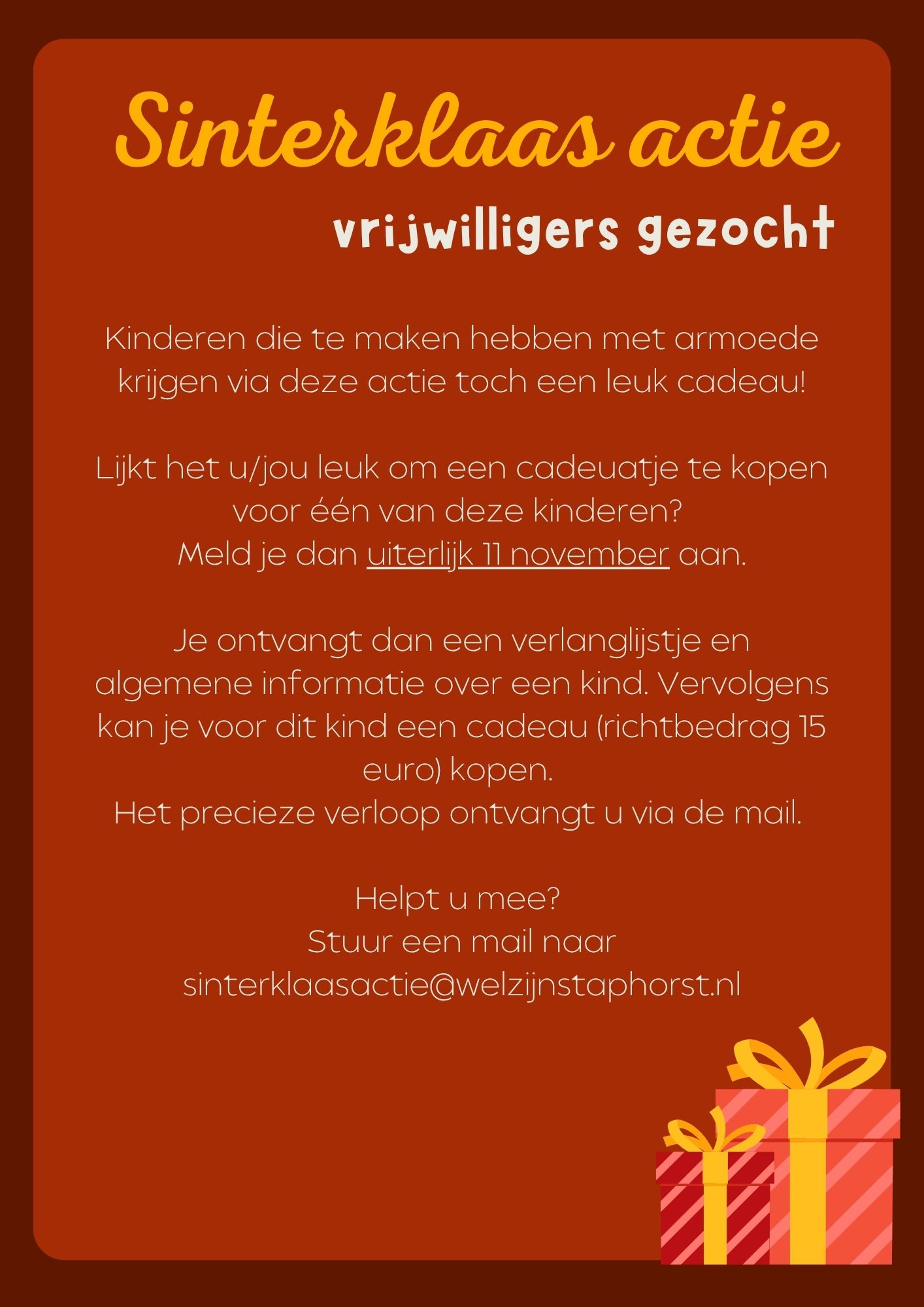 De actie is bedoeld voor kinderen geboren tussen 2013 en 2025. Ouders en/of verzorgers met een laag inkomen of die financieel moeilijk rondkomen kunnen hun kind(eren) aanmelden. Dit kan eenvoudig door een mail te sturen naar sinterklaasactie@welzijnstaphorst.nl.