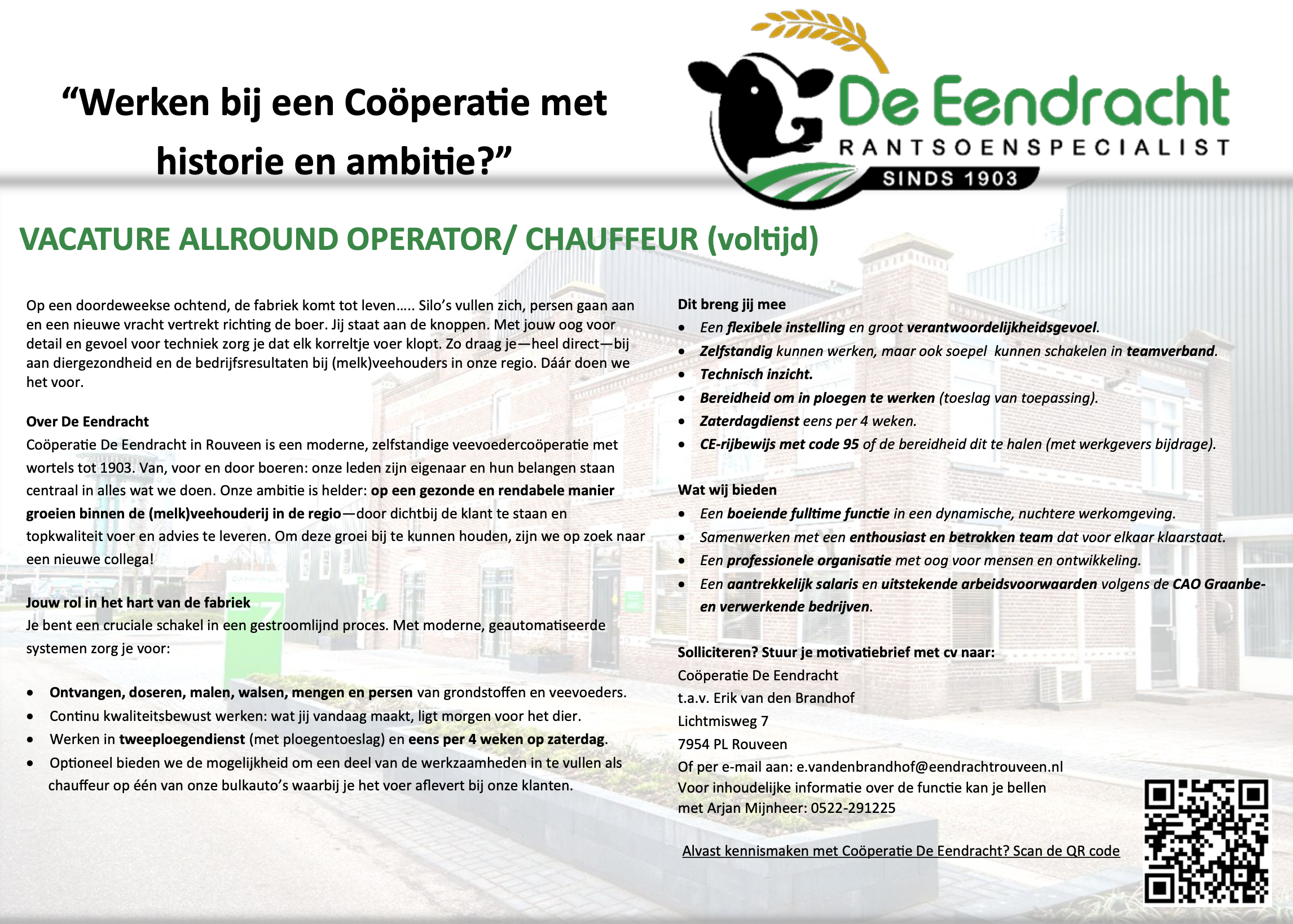 Coöperatie De Eendracht in Rouveen is een moderne, zelfstandige veevoedercoöperatie met wortels tot 1903. Van, voor en door boeren: onze leden zijn eigenaar en hun belangen staan centraal in alles wat we doen. Onze ambitie is helder: op een gezonde en rendabele manier groeien binnen de (melk)veehouderij in de regio—door dichtbij de klant te staan en topkwaliteit voer en advies te leveren. Om deze groei bij te kunnen houden, zijn we op zoek naar een nieuwe collega!