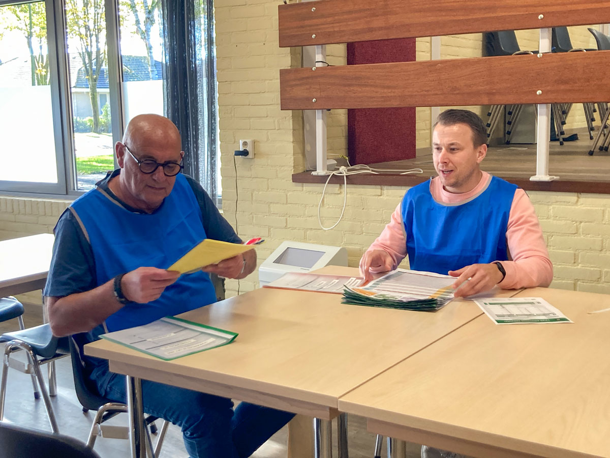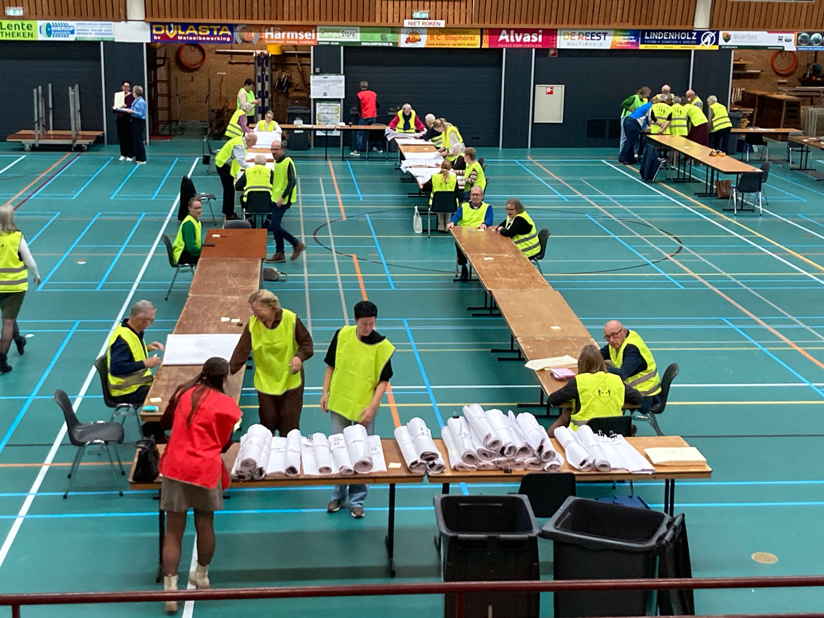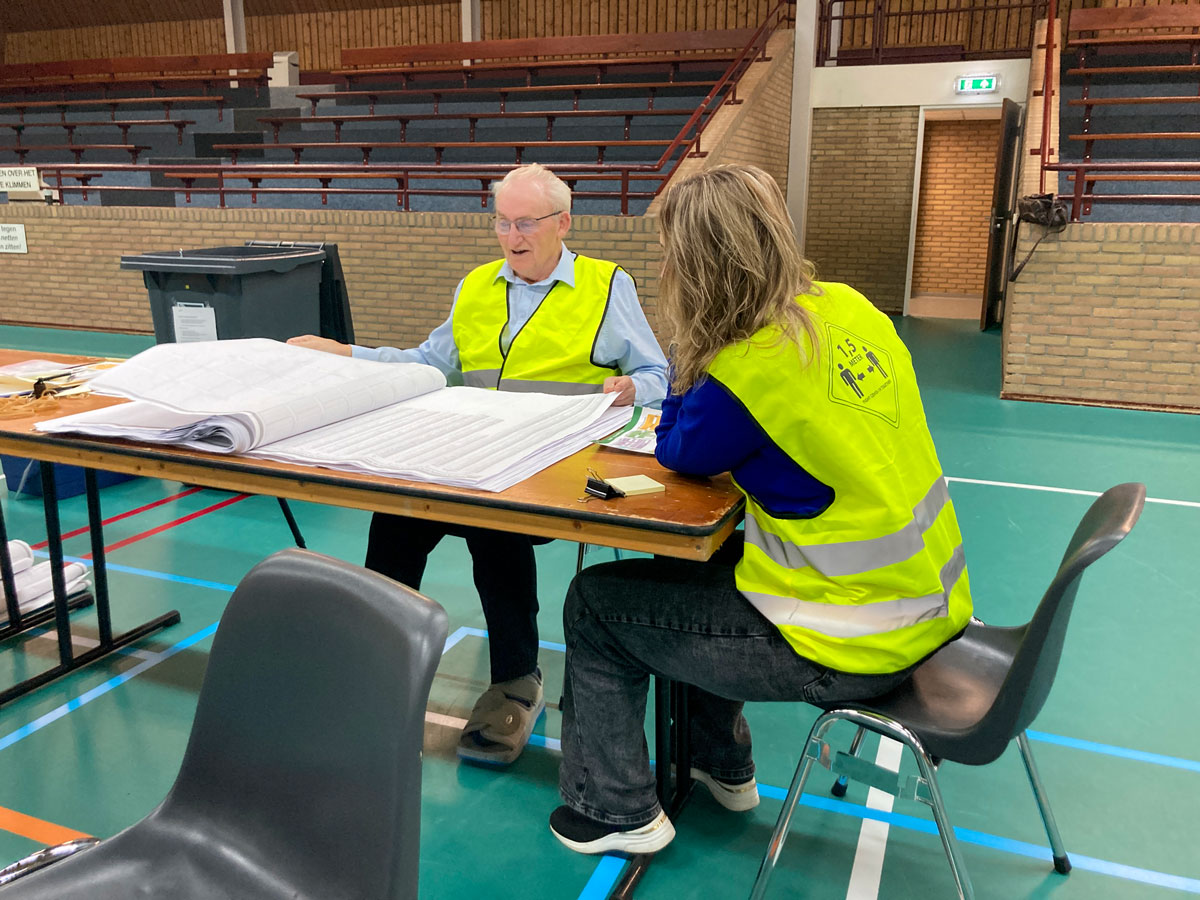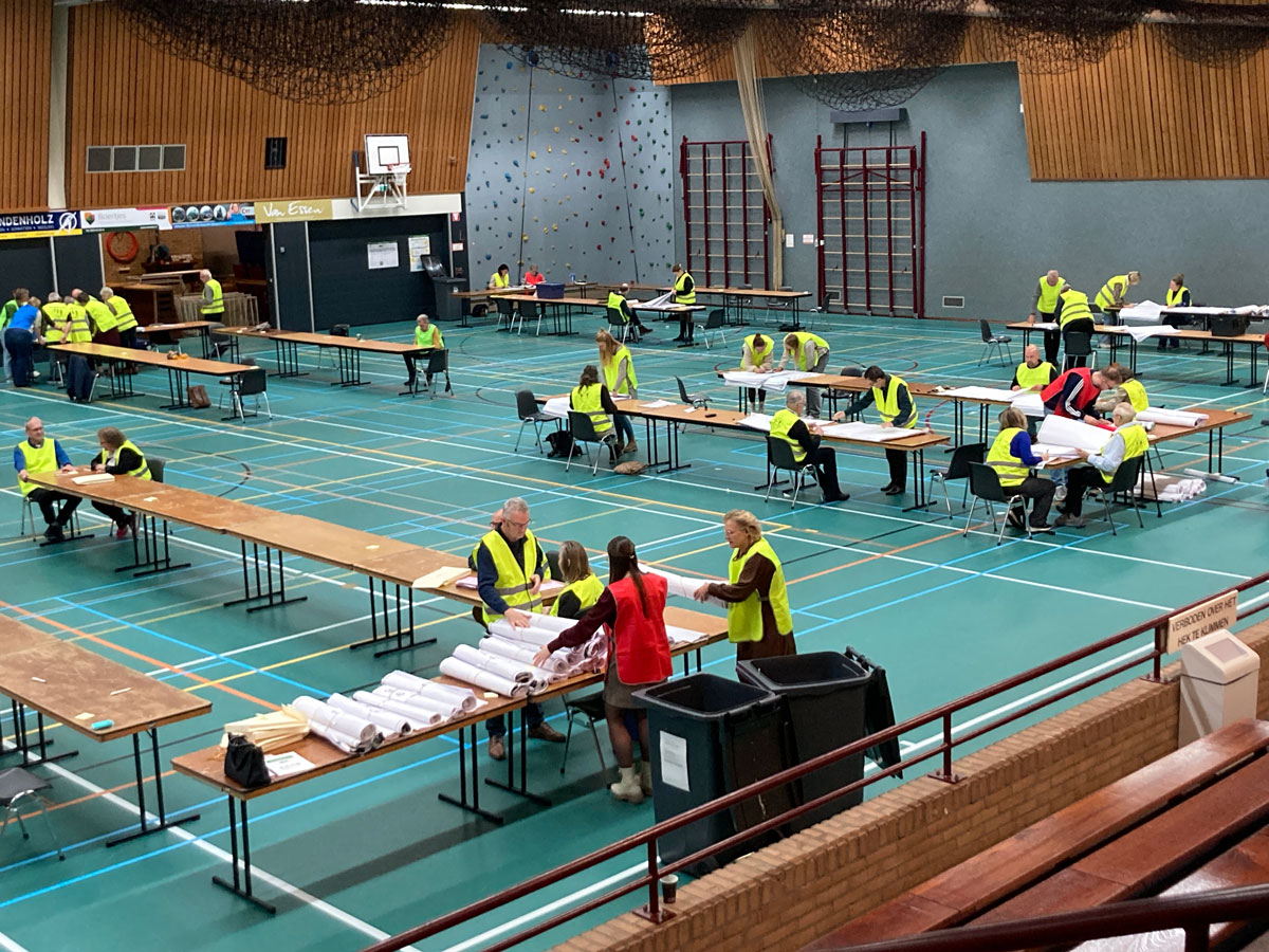 De mensen in de gele hesjes zijn aan het tellen. De mensen in de blauwe hesjes zijn van het gemeentelijk stembureau en het OSV team. Het gemeentelijk stembureau houdt toezicht op de telling, zij zorgen dat alles goed verloopt en zij gaan alles controleren. Het OSV team, Ondersteunende Software Verkiezingen, zit in een aparte ruimte en gaan alle uitslagen ‘overkloppen’. Alles wordt onder het ‘vier ogen principe’ bekeken. Vervolgens wordt de uitkomst ge-upload in het Tel Uitslagen Platform en daarna gepubliceerd.