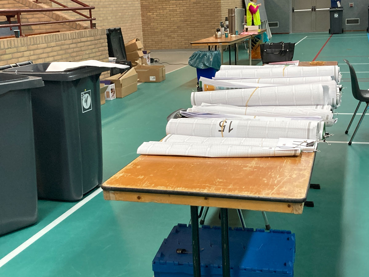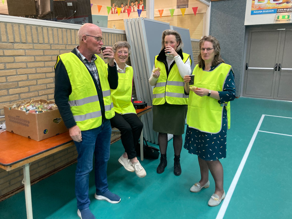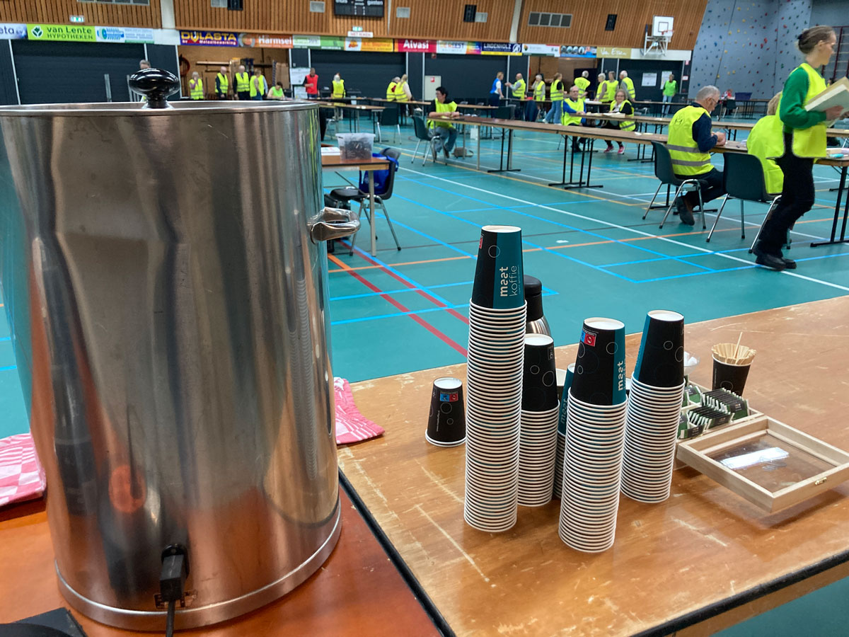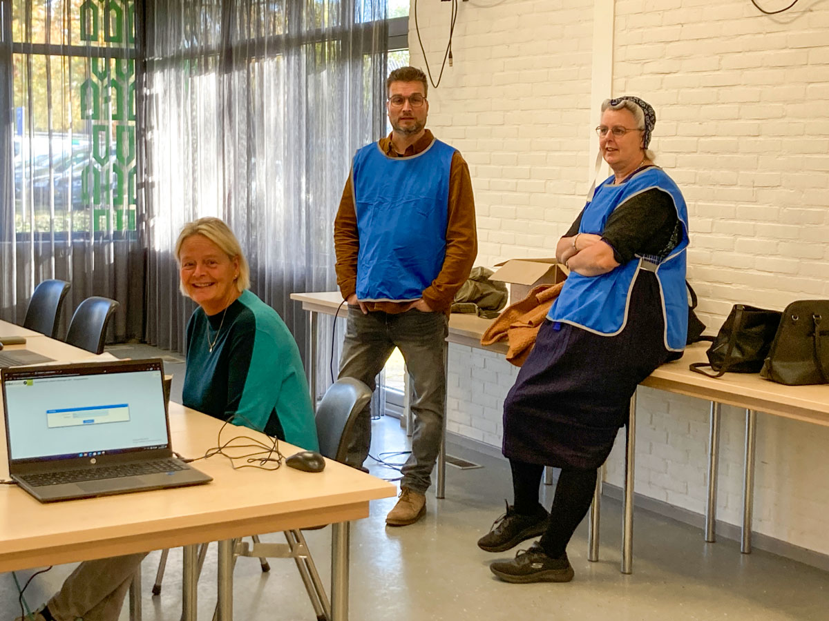 De mensen in de gele hesjes zijn aan het tellen. De mensen in de blauwe hesjes zijn van het gemeentelijk stembureau en het OSV team. Het gemeentelijk stembureau houdt toezicht op de telling, zij zorgen dat alles goed verloopt en zij gaan alles controleren. Het OSV team, Ondersteunende Software Verkiezingen, zit in een aparte ruimte en gaan alle uitslagen ‘overkloppen’. Alles wordt onder het ‘vier ogen principe’ bekeken. Vervolgens wordt de uitkomst ge-upload in het Tel Uitslagen Platform en daarna gepubliceerd.