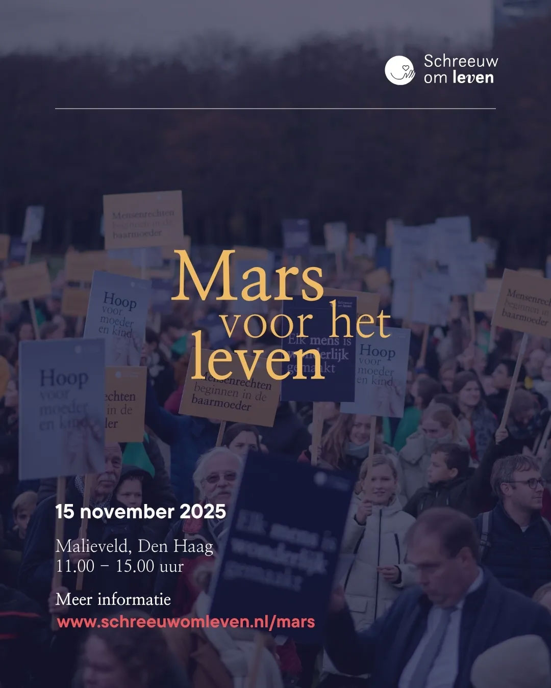 De Mars voor het leven vindt plaats op D.V. 15 november in Den Haag. Duizenden deelnemers lopen een stille Mars met de boodschap ‘voor een abortusvrije samenleving!’. Door te werken aan een hoopvolle toekomst voor moeder, vader en kind, zorgen we dat abortus onnodig en ondenkbaar wordt.