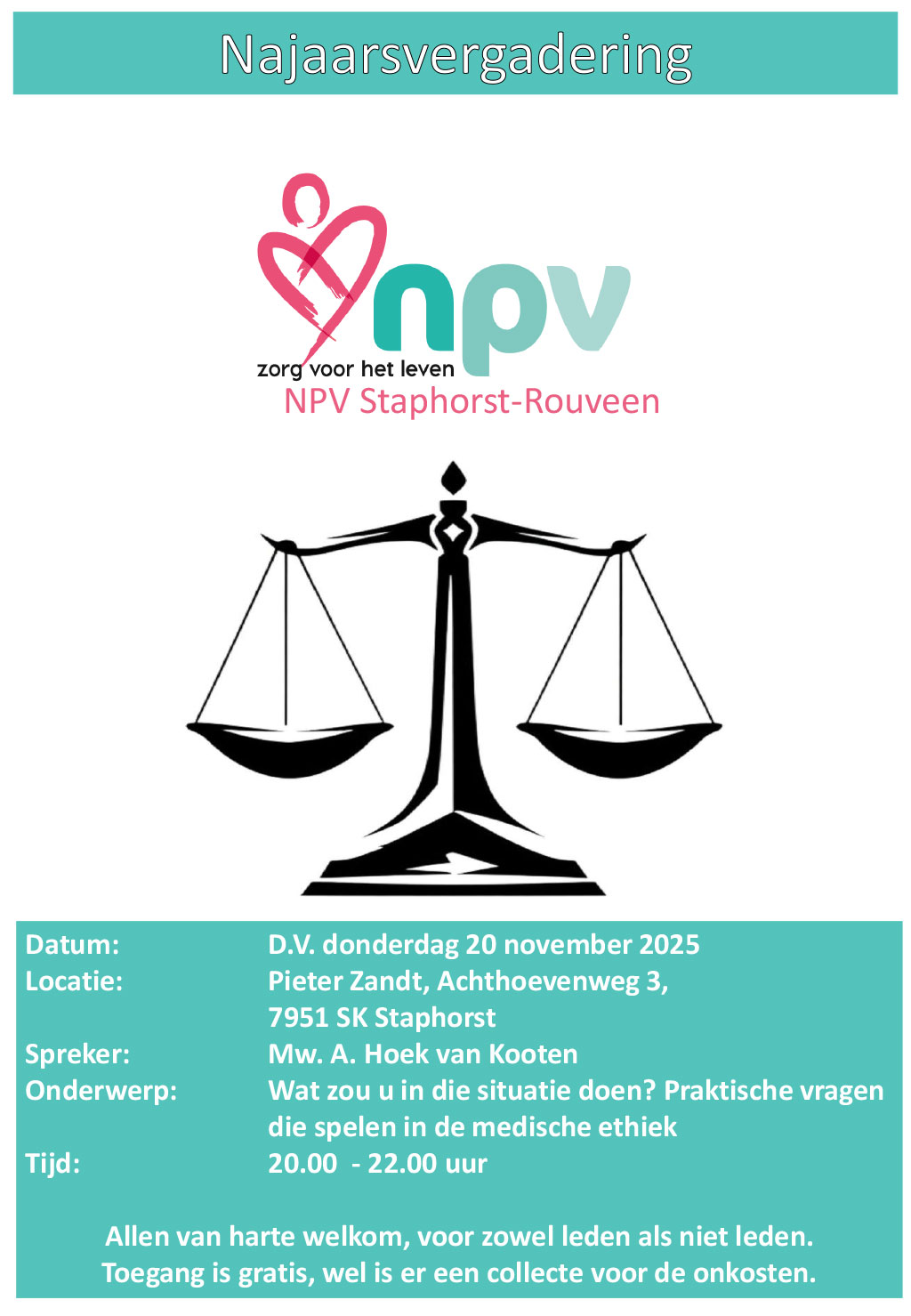 De NPV afdeling Staphorst – Rouveen hoopt D.V. 20 november haar najaarsbijeenkomst te houden. Mevr. Hoek- van Kooten zal deze avond een lezing verzorgen met als titel: Wat zou u in die situatie doen? Praktische vragen die spelen in de medische Ethiek.