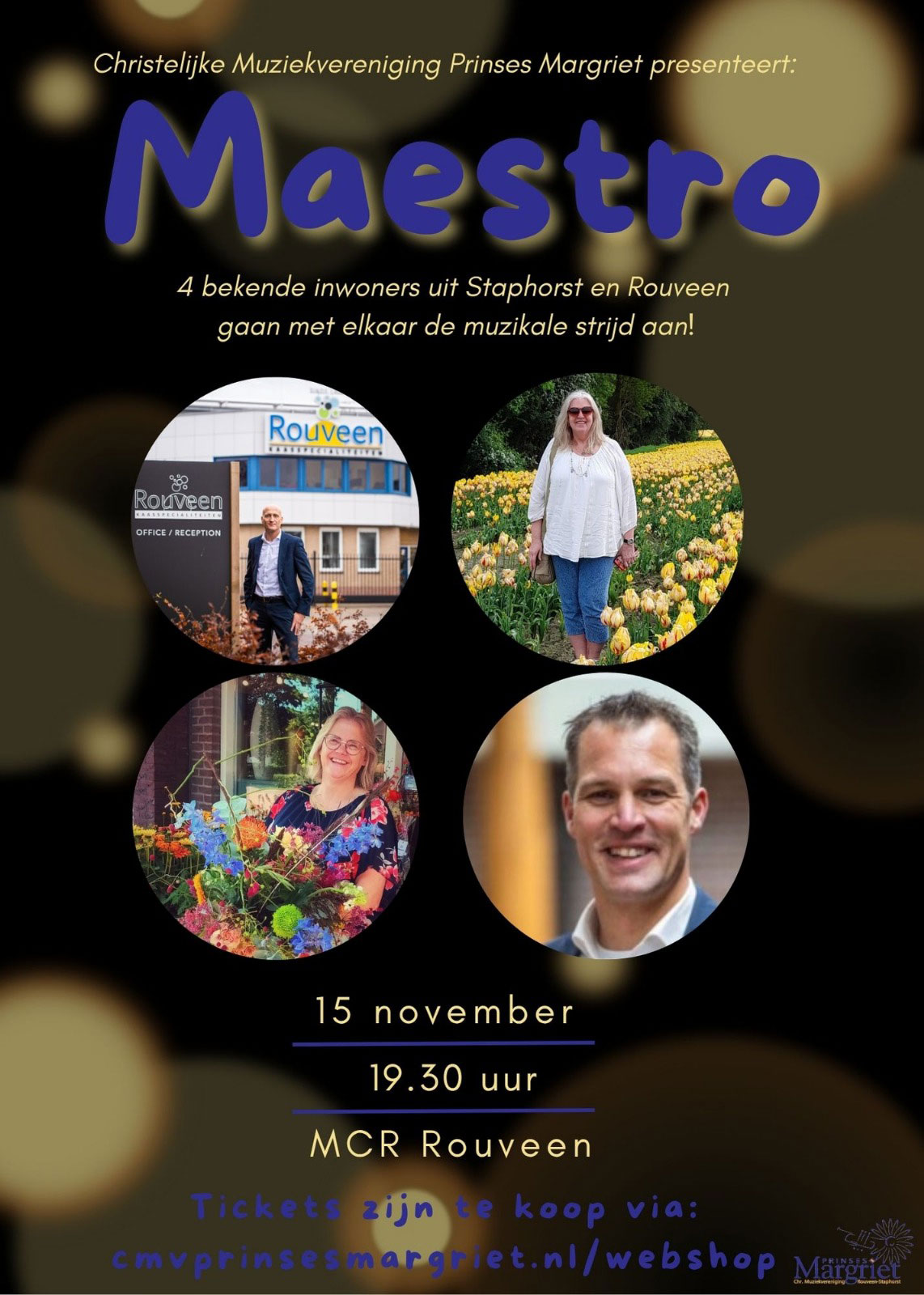 Zaterdagavond 15 november gaat CMV Prinses Margriet op zoek naar de beste amateurdirigent van Rouveen & Staphorst. Deze avond zullen 4 bekende Rouveners en Staphorsters de muzikale strijd met elkaar aangaan!