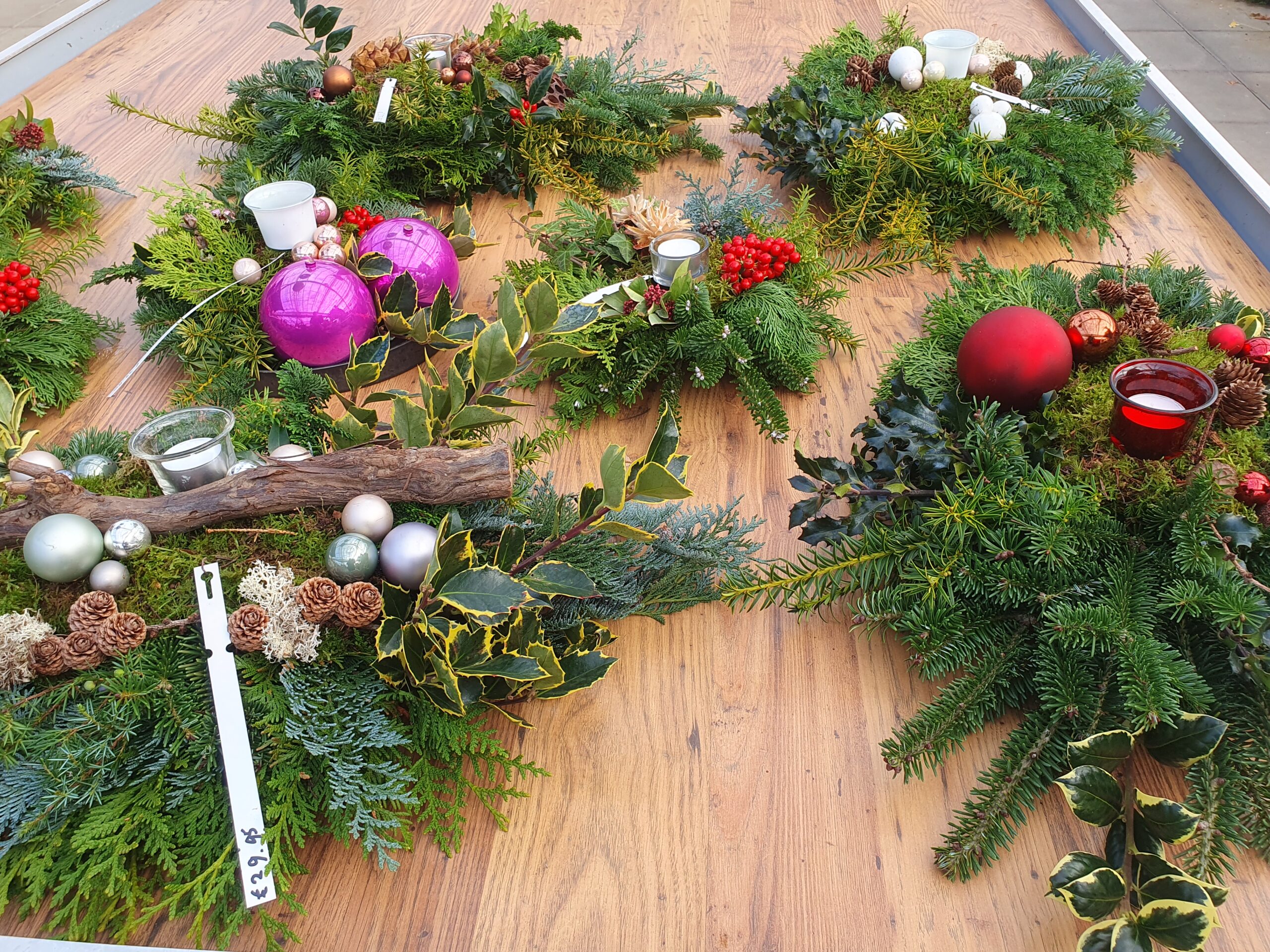 De hele dag door maakt het team van Onderdijk allerlei soorten kerststukjes. Groot en klein, standaard of apart, er is van alles wat. Maar wel allemaal met een natuurlijke sfeer.