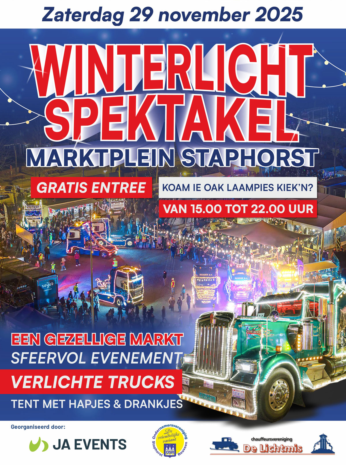 Op zaterdag 29 november aanstaande komt het Winterlicht Spektakel naar de markt in Staphorst, dit geeft het nodig vertier maar ook de nodige oponthoud !