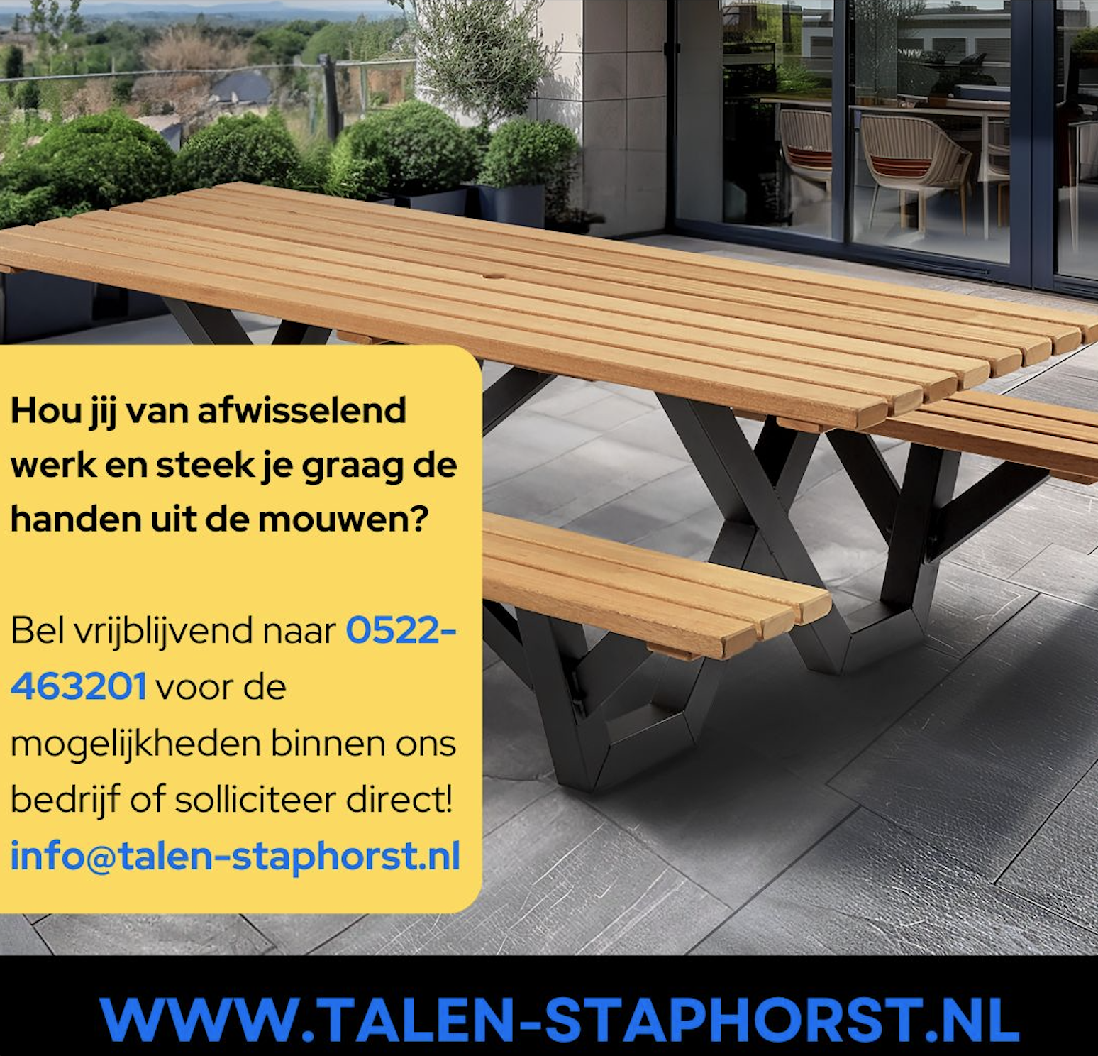 Talen Staphorst is een familiebedrijf dat gespecialiseerd is in het ontwerpen, produceren en verkopen van hoogwaardige tuinmeubelen en buitenaccessoires. Dit alles ontworpen en vervaardigd met oog op detail en van duurzaam hout, geschikt voor de buitenomgeving. Producten om jarenlang plezier van te hebben en het comfort te genieten.