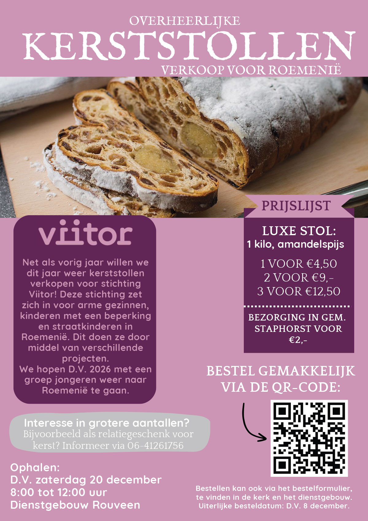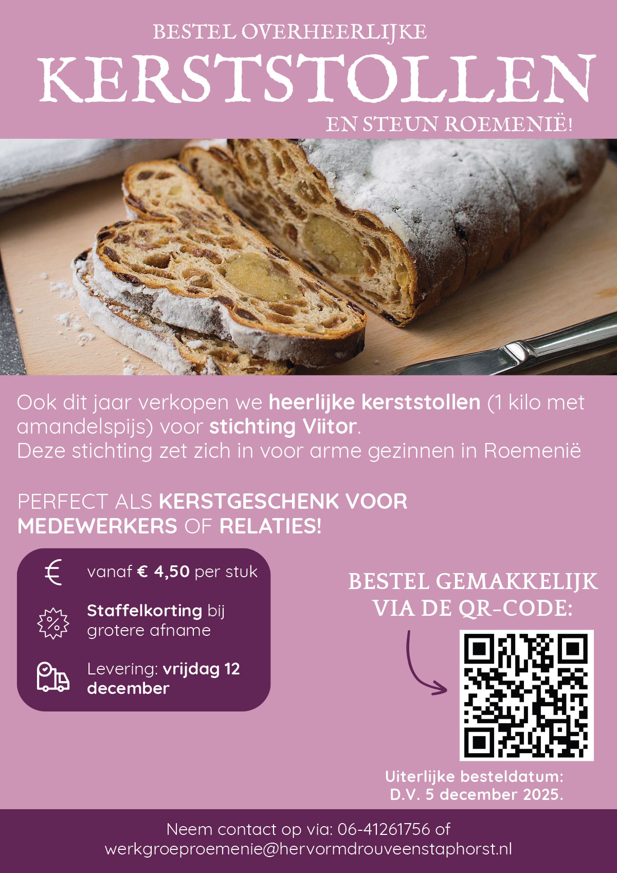 Ook dit jaar verkopen wij, werkgroep Roemenië van Herv. Gem. Rouveen-Staphorst, weer kerststollen (1000 gr. Amandelspijs) voor Roemenië. Volgend jaar, D.V. 2026, hopen we hier met een groep jongeren naar toe te reizen om een gezin te helpen bij het verbouwen van hun woning. Dit project word begeleid door stichting Viitor, meer info: https://stichting-viitor.nl/ .