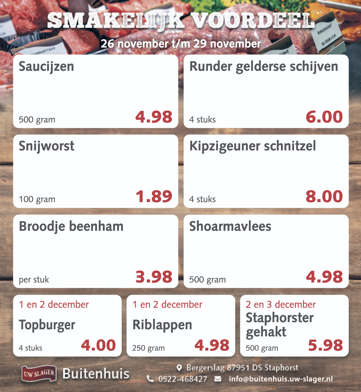 Uw Slager Buitenhuis – weekaanbieding 26 november t/m 29 november