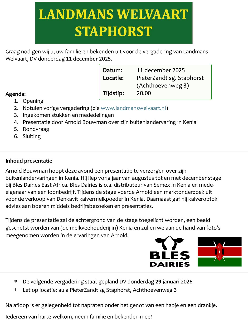 Vergadering Landmans Welvaart met Arnold Bouwman over zijn buitenland ervaring in Kenia