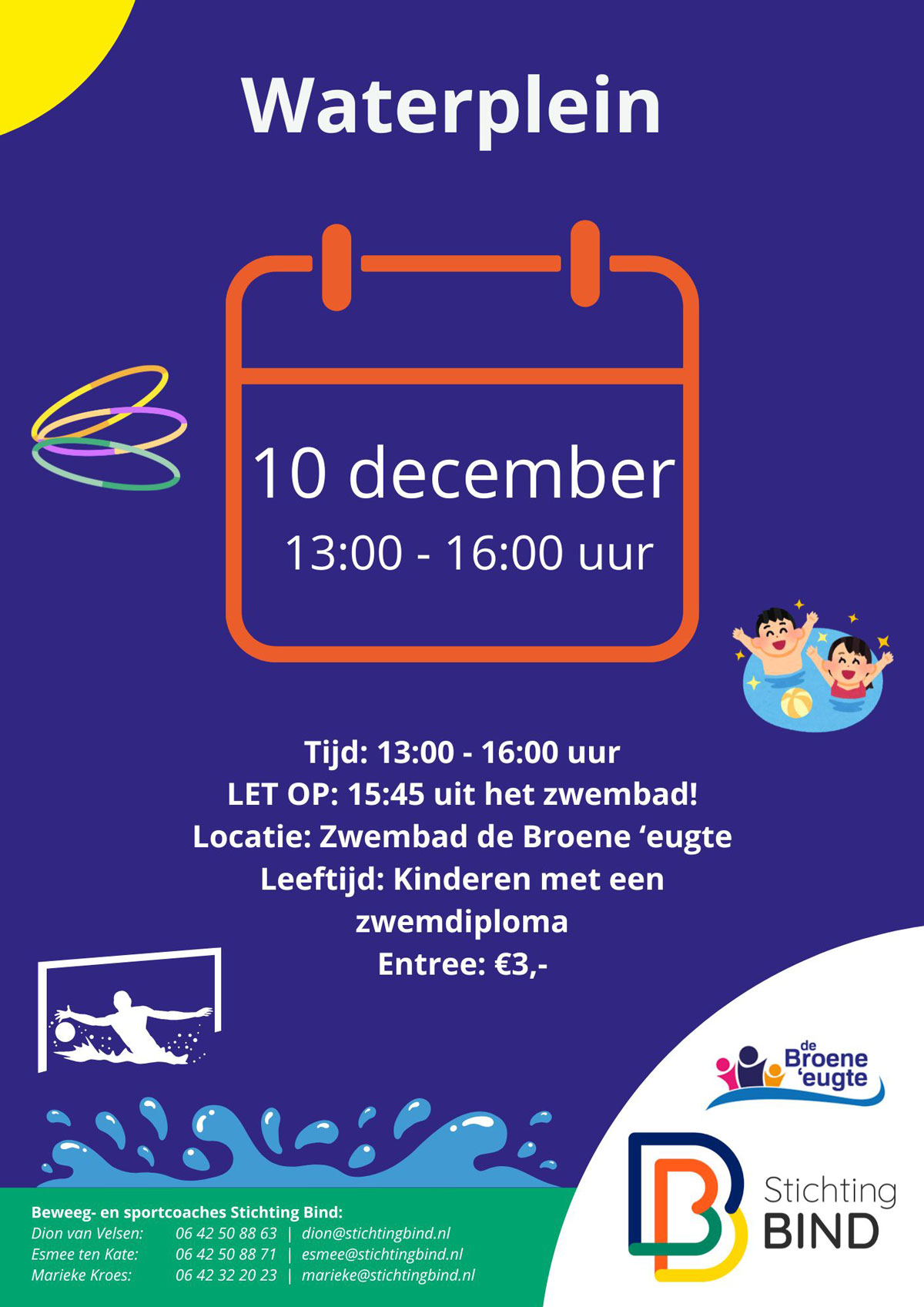 Op woensdag 10 december is het weer zo ver, dan vindt er weer een natte versie van het speel- en beweegplein plaats, namelijk het waterplein! Als je deel wilt nemen aan het waterplein betaal je €3,00,- entree voor het zwembad (i.p.v. € 4,20-) en kun je meedoen aan de activiteiten van de beweeg- en sportcoaches van Stichting BIND en vrij zwemmen! Voor meer informatie zie de flyer.