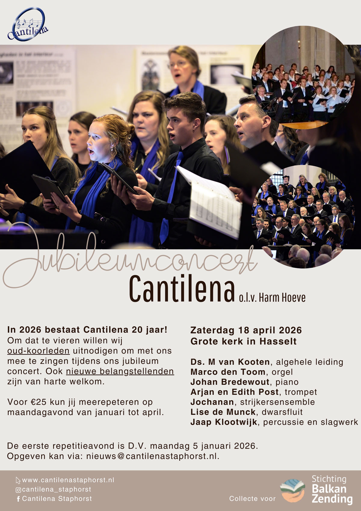 In 2026 bestaat het Reformatorisch Gemengd Koor Cantilena 20 jaar. Ter gelegenheid van dit jubileum organiseert het koor een jubileumconcert op D.V. zaterdag 18 april 2026 in de Grote Kerk van Hasselt onder leiding van dirigent Harm Hoeve. Hiervoor nodigen wij zowel oud-leden (ook oud-leden van het kinderkoor) als nieuwe leden van harte uit om mee te zingen.