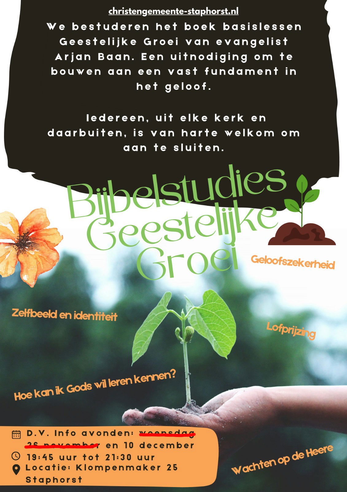 Op D.V. woensdagavond 26 november en 10 december om 19:45 uur staan er introductie- en startavonden gepland voor mensen die op zoek zijn Geestelijke Groei of daar meer over willen leren. Er wordt gewerkt vanuit het boek Geestelijke Groei die uitgegeven is door evangelist Arjan Baan. Dit boek behandeld alle belangrijke aspecten van het geloofsleven. In 2026 zal er elke 2 weken op woensdagavond een onderdeel behandeld worden.