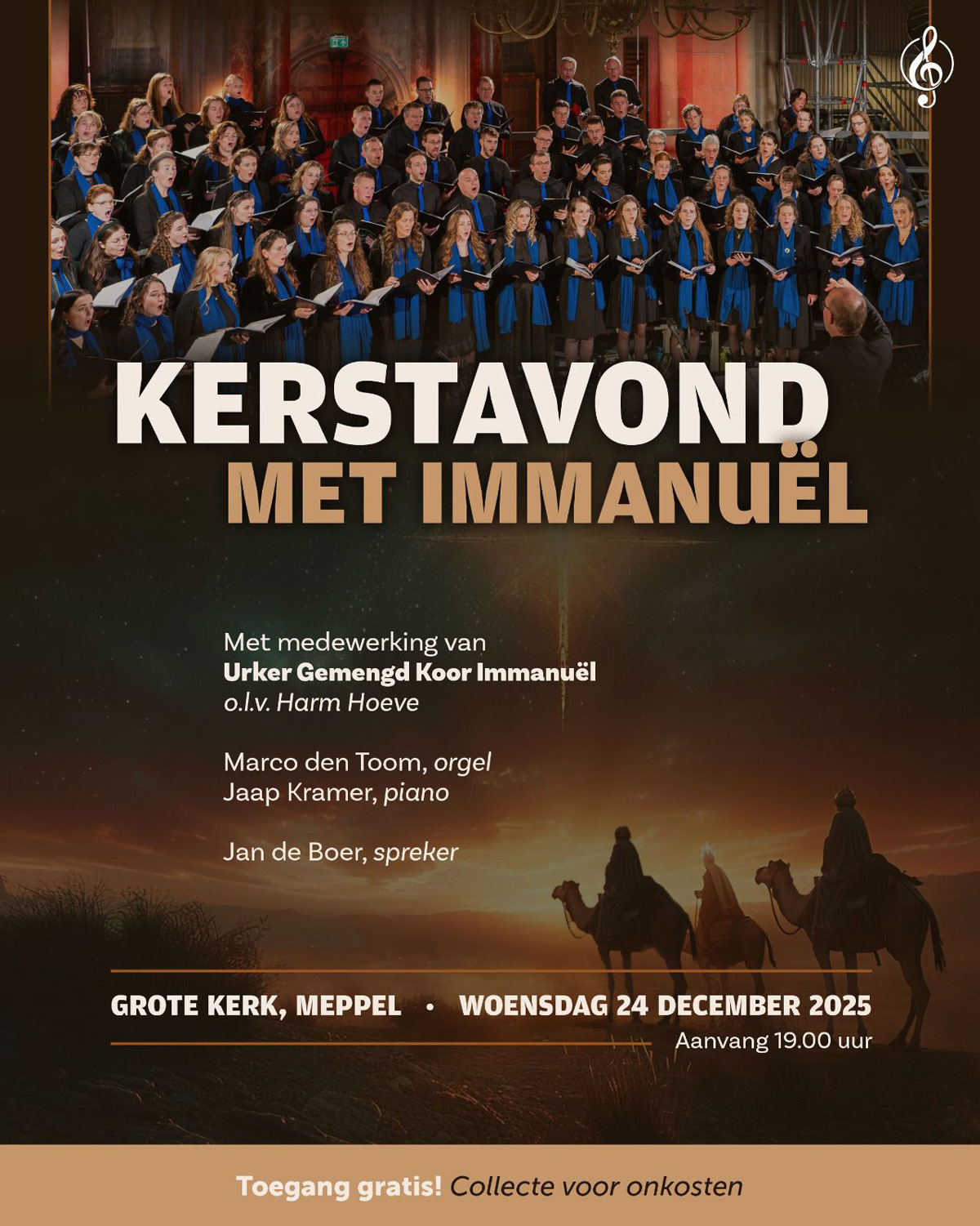 Onder leiding van dirigent Harm Hoeve brengt het koor een sfeervol en afwisselend kerstprogramma ten gehore. Aan de piano begeleidt Jaap Kramer, terwijl Marco den Toom het orgel bespeelt. De avond wordt verder ingevuld met een kerstmeditatie door Jan de Boer uit Urk.