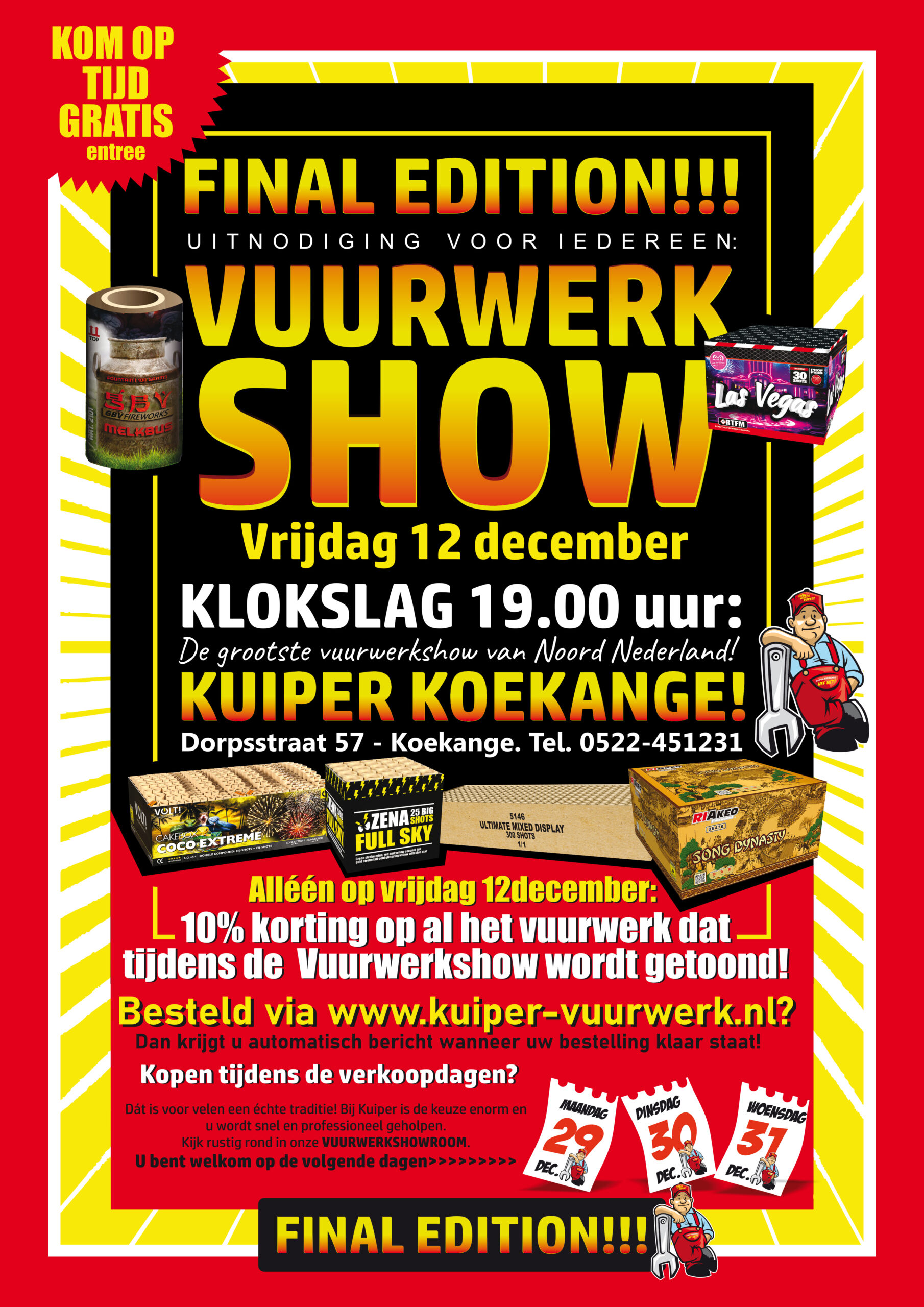 Vrijdag 12 december om 19.00 uur beleef je de grootste vuurwerkshow van Noord-Nederland bij Kuiper! Tijdens deze show zie je het mooiste siervuurwerk én ontvang je alleen op deze avond 10% korting op al het vuurwerk dat wordt getoond.