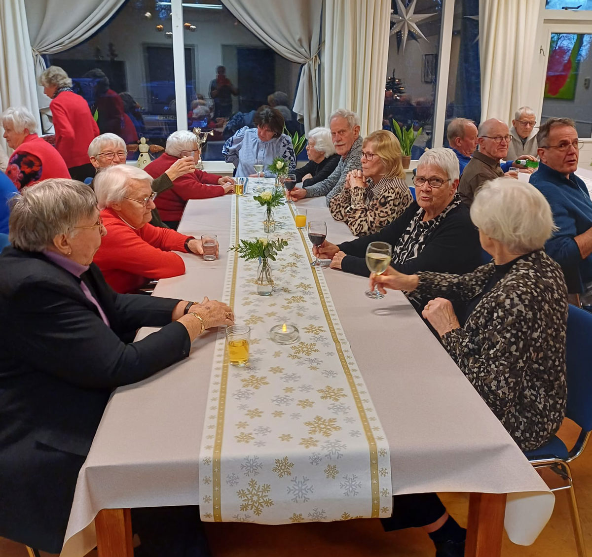 Donderdagmiddag 18 december was de grote zaal van de Poele in IJhorst gevuld met vrolijk stemde gasten. Aan mooi gedekte tafels genoten de bezoekers van lekkernijen en vooral van elkaars gezelschap