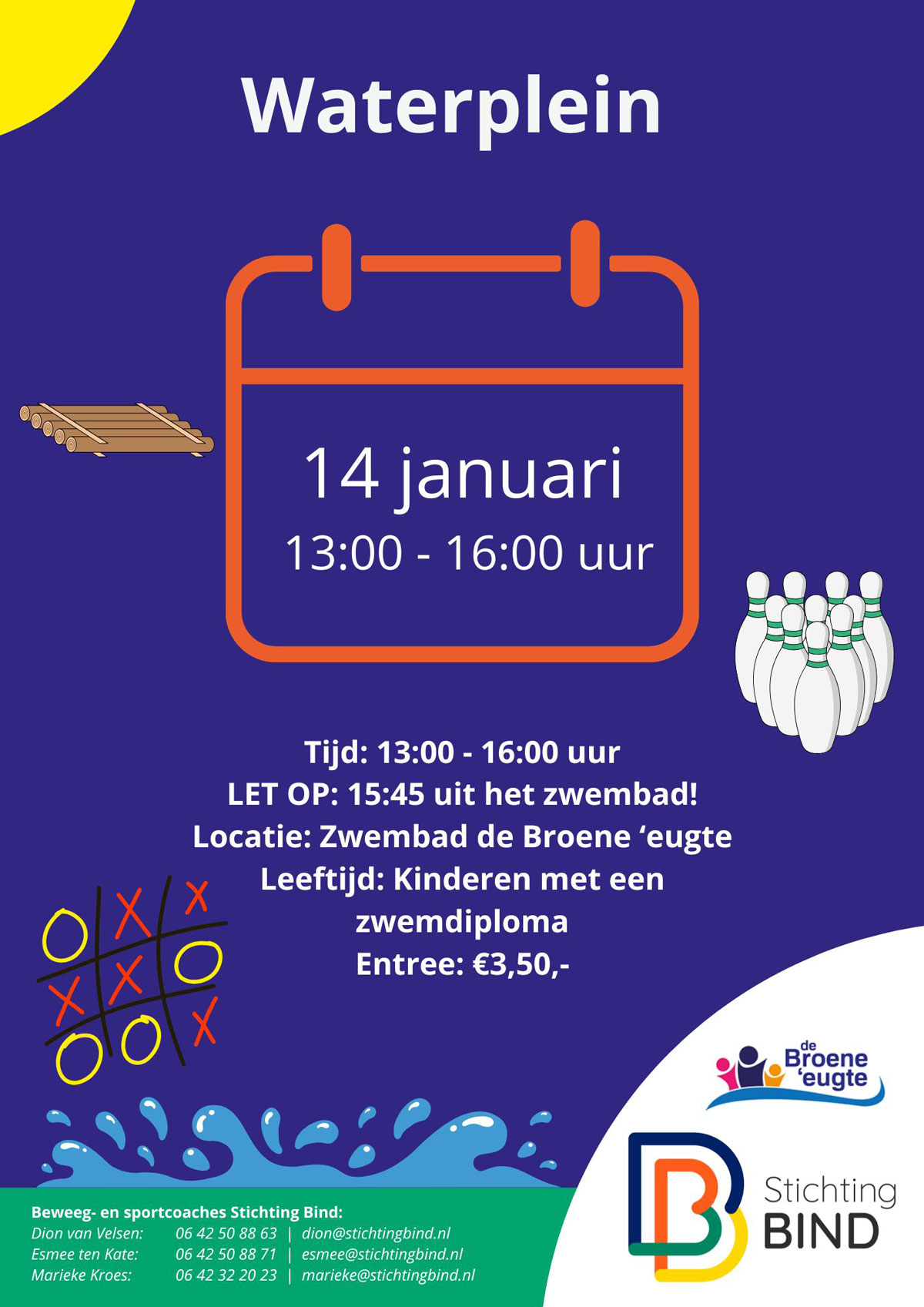Op woensdag 14 januari is het weer zo ver, dan vindt er weer een natte versie van het speel- en beweegplein plaats, namelijk het waterplein! Als je deel wilt nemen aan het waterplein betaal je €3,50,- entree voor het zwembad en kun je meedoen aan de activiteiten van de beweeg- en sportcoaches van Stichting BIND en vrij zwemmen! Voor meer informatie zie de poster.