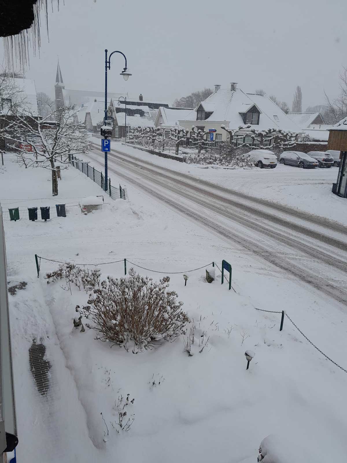 De hoofdweg verstild, ijspegels aan de daken en sneeuw die elk detail verzacht. Winter op z’n mooist.