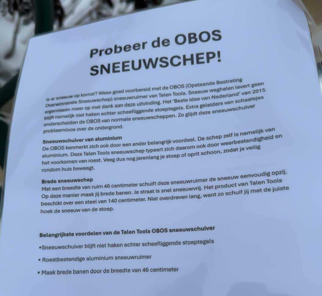 Sneeuwscheppen in verschillende formaten, ook voor kinderen. Zelfs de OBOS sneeuwschep te verkrijgen en te testen.