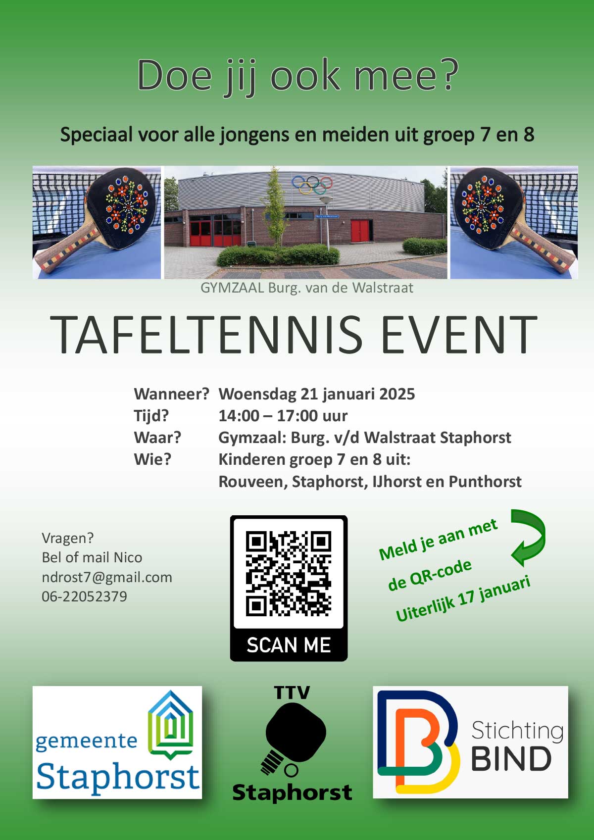 Zie poster tafeltennisevent 2026, welke bij alle basisscholen in de gemeente Staphorst door Stichting Bind zijn bezorgd.