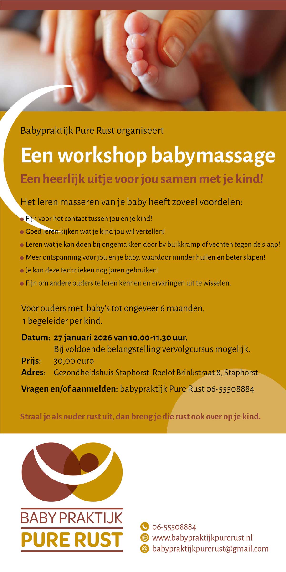 Dinsdag 27 januari organiseert Babypraktijk Pure Rust een workshop babymassage voor ouders met baby’s tot ongeveer 6 maanden.