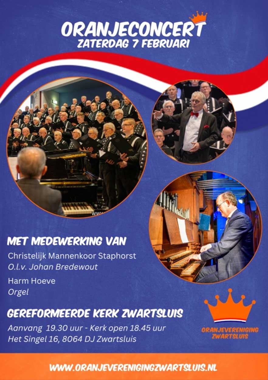 In de jarenlange traditie van Oranjeconcerten in Zwartsluis is het dit jaar de beurt aan ‘buurman’ Christelijk Mannenkoor Staphorst. Aangestuurd door dirigent Johan Bredewout treedt het koor zaterdag 7 februari op in de Gereformeerde kerk van Zwartsluis.