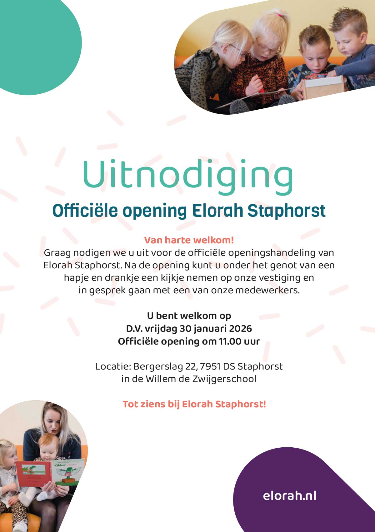 Sinds 5 januari heeft Elorah de peutergroep van Stichting Spelenderwijs overgenomen. Daarnaast start Elorah ook met buitenschoolse opvang en dagopvang. Om de start te vieren, wordt Elorah Staphorst officieel geopend op vrijdag 30 januari 2026. Inwoners van Staphorst zijn welkom om die middag een kijkje te nemen op de vestiging tijdens de open inloop tussen 13.30 en 15.00 uur. Elorah Staphorst is gevestigd in de Willem de Zwijgerschool in Staphorst.