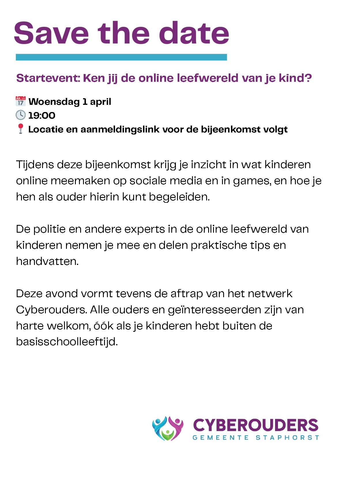 In de gemeente Staphorst starten we met een netwerk van Cyberouders. Het doel is om de digitale weerbaarheid van kinderen vroegtijdig te versterken door ouders te ondersteunen en toe te rusten om hun kinderen te begeleiden in een wereld van sociale media en online games. Dagelijks zijn er meer dan 6.500 gemelde slachtoffers van online criminaliteit in Nederland. Ook kinderen vormen hierin een kwetsbare doelgroep. Uit onderzoek blijkt dat ouders vaak onvoldoende weten wat er online speelt en dat hierover weinig gesprekken worden gevoerd.