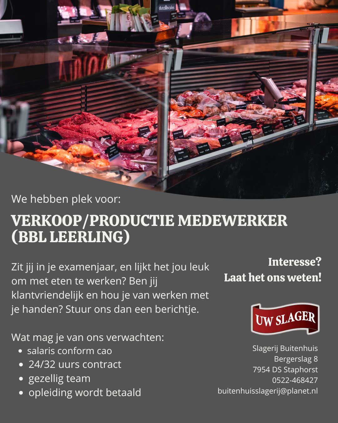 Slagerij Buitenhuis heeft plek voor: Verkoop/productie medewerker (BBL Leerling)