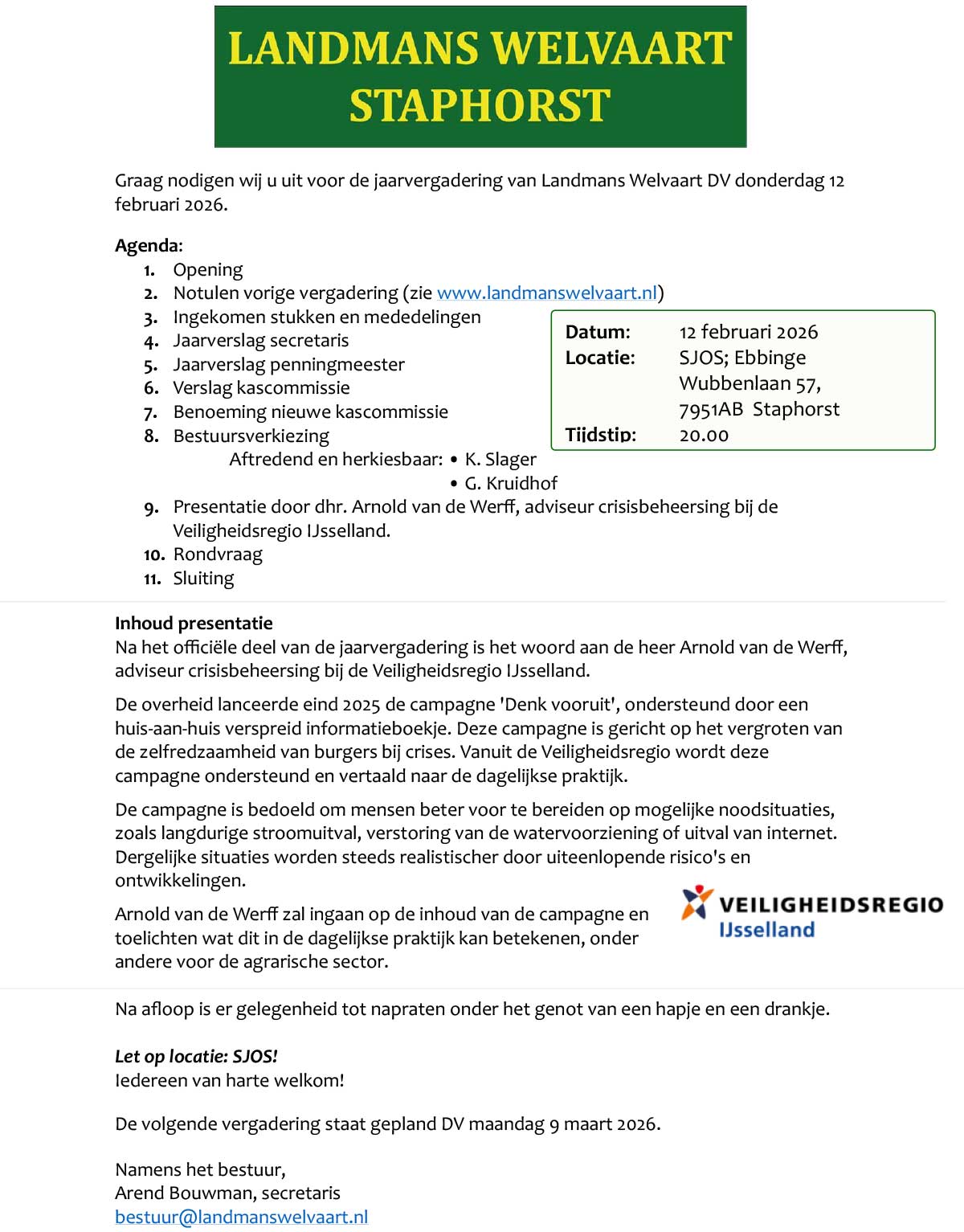 Vergadering Landmans Welvaart met gastspreker over Noodsituaties
