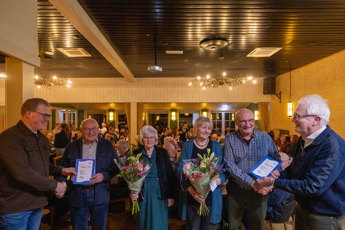 STAPHORST – Tijdens de jaarlijkse ledenvergadering van het Christelijk Mannenkoor Staphorst stonden twee trouwe zangers in het zonnetje. Jan Bloemert werd gehuldigd voor zijn 55-jarig lidmaatschap, terwijl Henk Bisschop de mijlpaal van 40 jaar bereikte. Beide jubilarissen ontvingen een oorkonde van de Koninklijke Christelijke Zangersbond. Hun echtgenotes werden verrast met een fleurige bloemengroet.