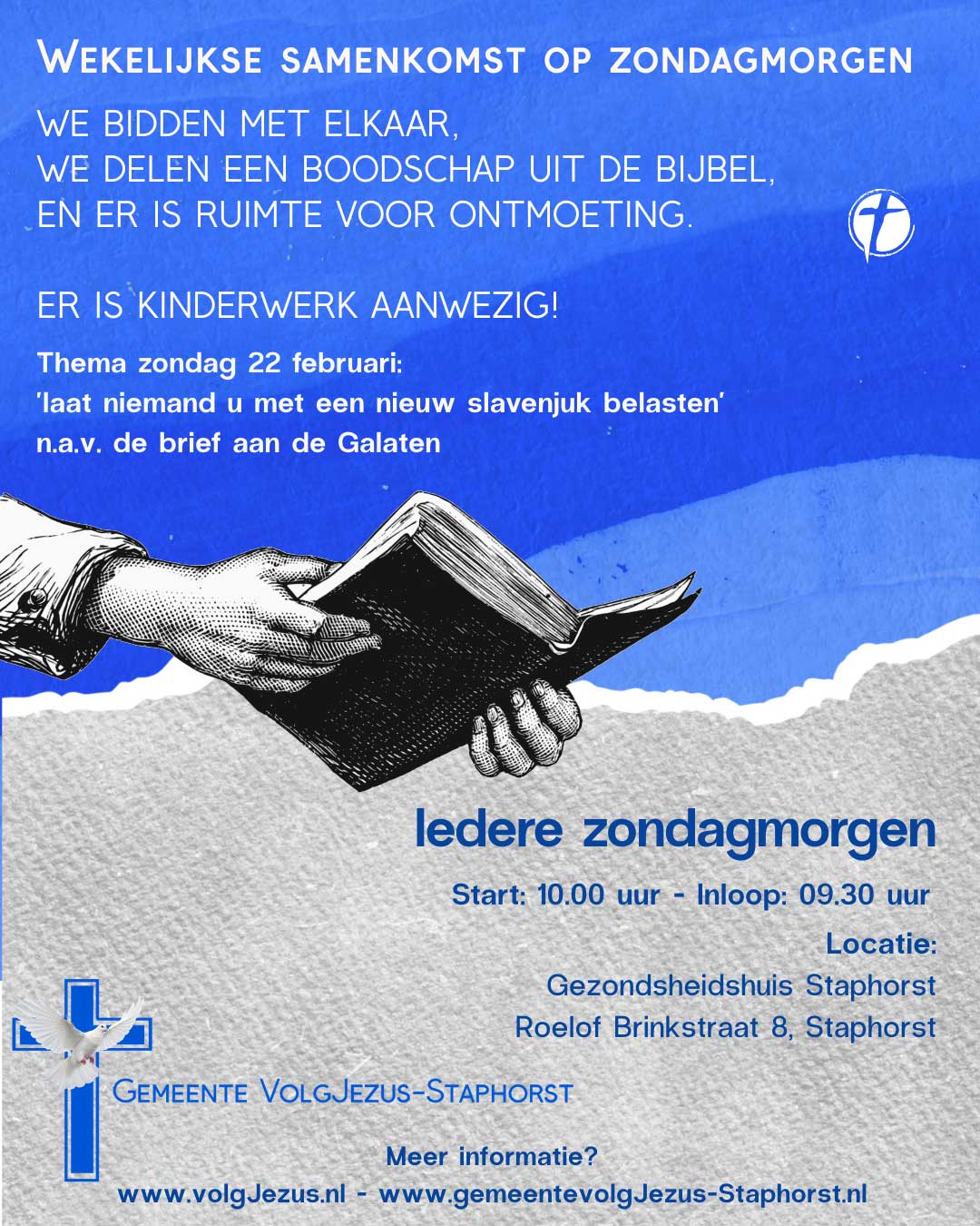 Op zondag 22 februari houdt gemeente volg Jezus – Staphorst een samenkomst met als thema ‘laat niemand u met een nieuw slavenjuk belasten’ naar aanleiding van de brief aan de Galaten.