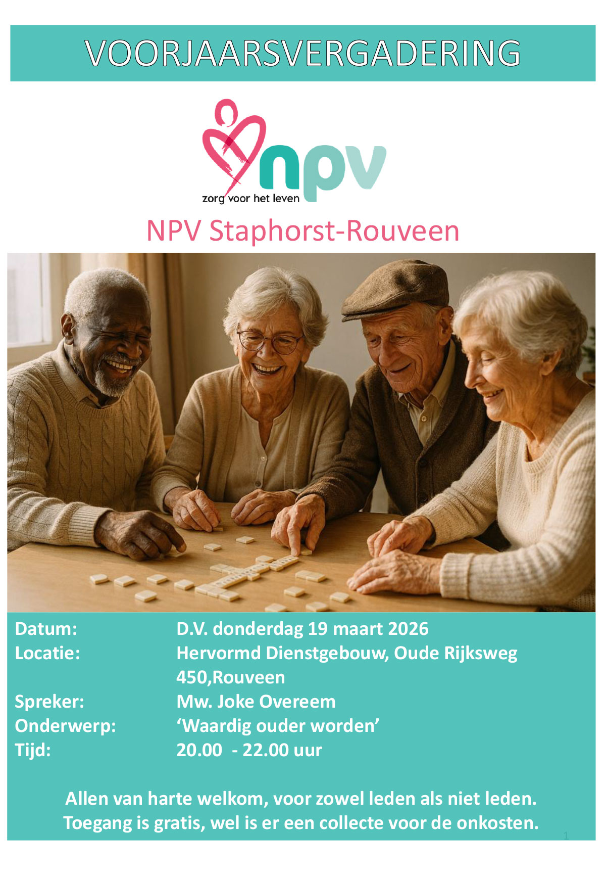 Mevr. Overeem geeft in de beschrijving als kern van de lezing: De diepste zin van ons bestaan ligt niet in wat je doet, maar in de betekenis die de Schepper aan je leven geeft. Ieder leven is van waarde, ongeacht de fase waarin iemand zich bevindt. We hopen op een goede jaarvergadering en een inspirerende lezing.
