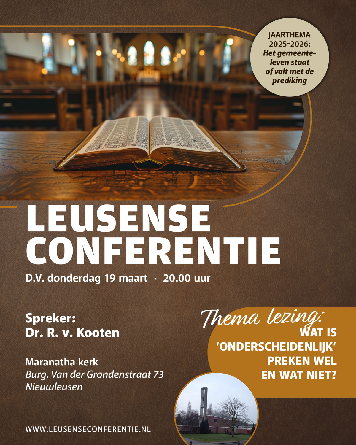 Dr. R. van Kooten (HHK) zal op 19 maart voor de Leusense Conferentie een lezing houden over: “wat is ‘onderscheidenlijk’ preken wel en wat niet”.