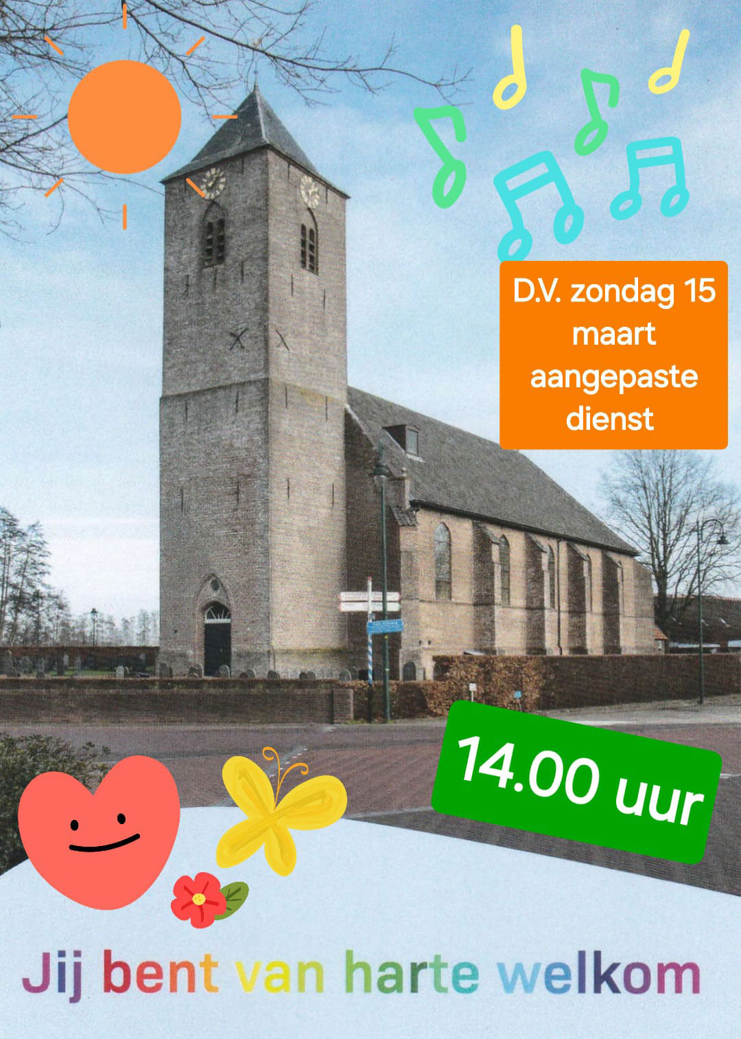 De voor iedereen toegankelijke dienst begint om 14:00uur de kerk is om13:30uur open. De voorganger is Ds. R. Duiker.
