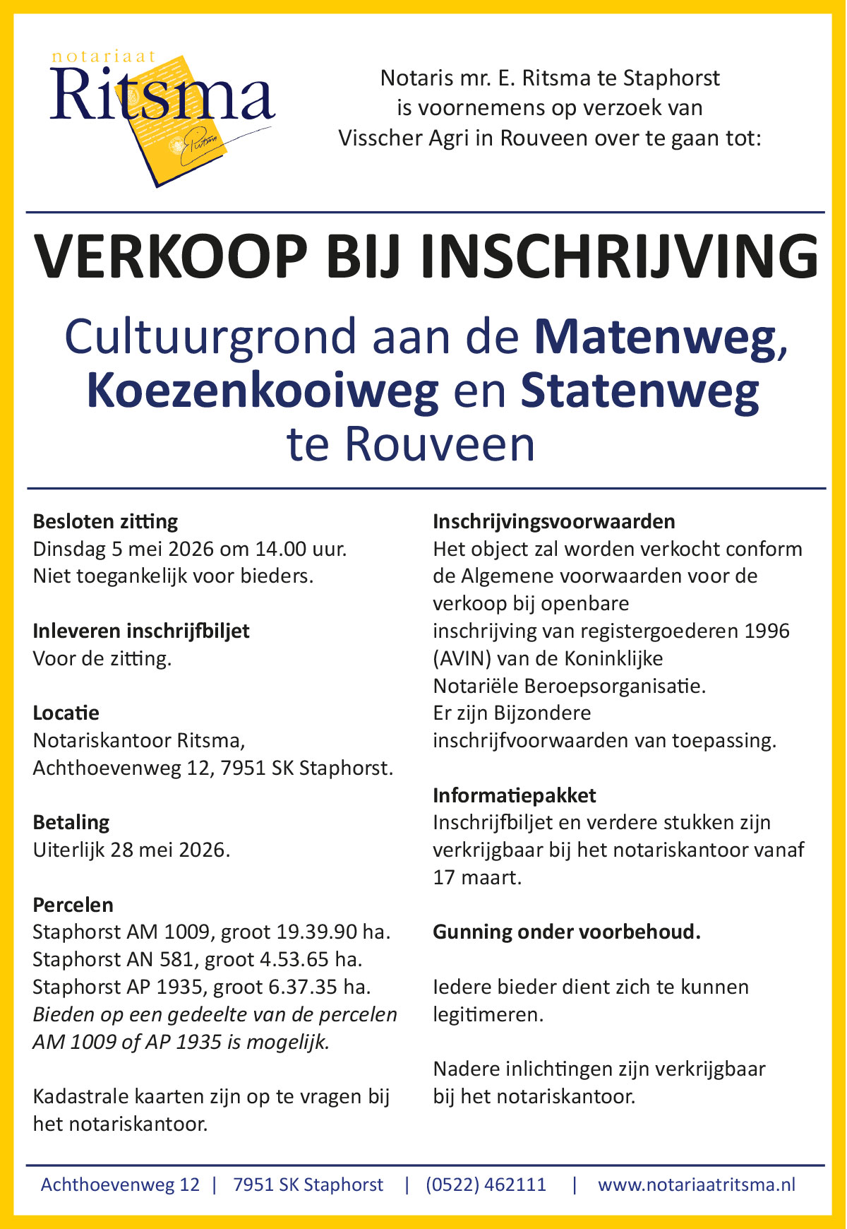 Verkoop bij inschrijving: Cultuurgrond aan de Matenweg, Koezenkooiweg en Statenweg te Rouveen