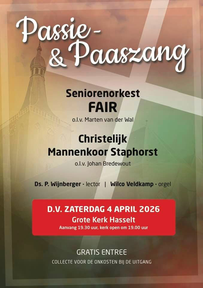 In de Grote Kerk van Hasselt vindt op Stille Zaterdag 4 april de jaarlijkse Passie- en Paaszang plaats. Seniorenorkest FAIR en het Christelijk Mannenkoor Staphorst verzorgen een meditatief moment dat in het teken staat van bezinning op het lijden, het sterven en de opstanding van Jezus Christus.