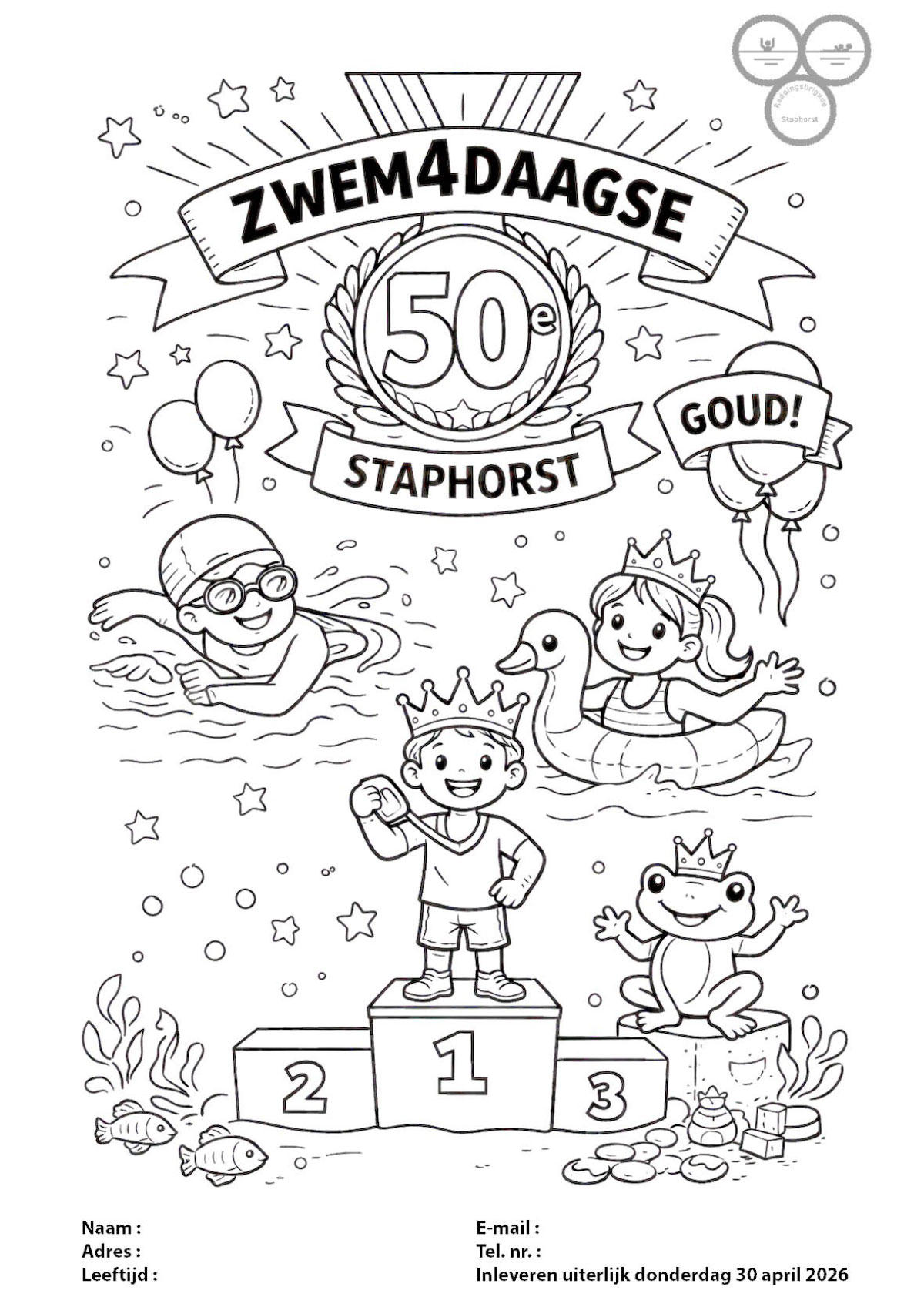 Binnenkort is het weer zo ver! In de meivakantie van 28 april tot en met 2 mei 2026 wordt voor de 50e keer de Zwem4daagse gehouden in zwembad “De Broene „Eugte” in Staphorst. Dit jaar staat de Zwem4daagse in het teken van goud. De Zwem4daagse wordt georganiseerd door Reddingsbrigade Staphorst. Bij de Zwem4daagse is het de bedoeling dat je verdeeld over vier dagen in totaal 2000 meter zwemt. Per dag dus 500 meter. In totaal zijn er vijf dagen waarop je de mogelijkheid hebt om te gaan zwemmen. Je kunt dus één keer overslaan als die dag niet zo goed uitkomt, uiteraard is het geen enkel probleem als je elke dag komt zwemmen. Ook bestaat de mogelijkheid om twee keer op één dag te zwemmen.