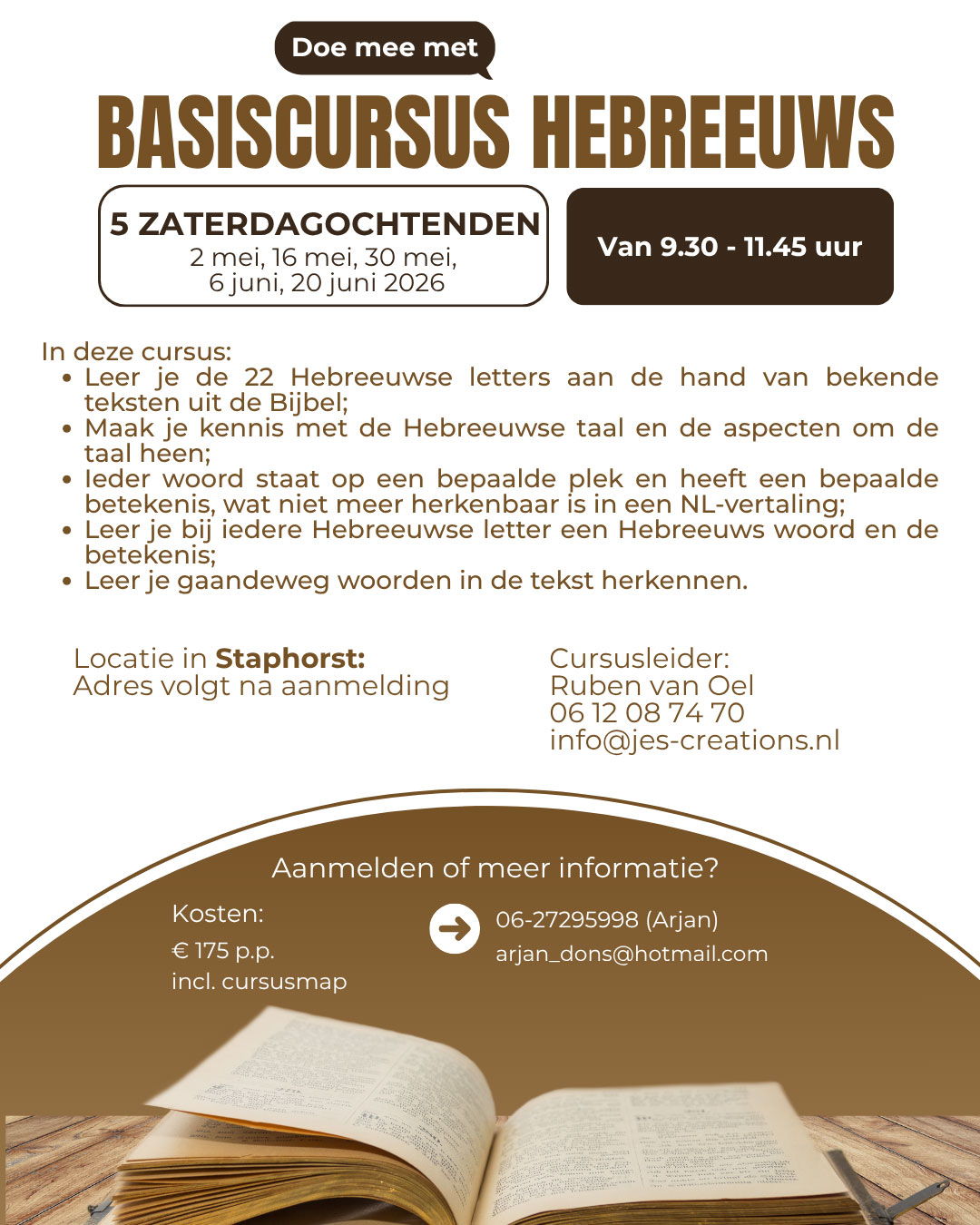 Binnenkort start er een basiscursus Hebreeuws in Staphorst. Deze zal gehouden worden op 5 zaterdagochtenden. Kosten voor deelname zijn € 175 p.p. Incl. Lesmateriaal.
