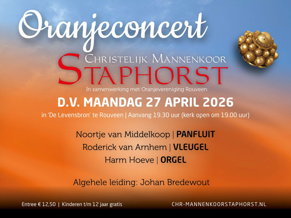 Kom op Koningsdag naar De Levensbron in Rouveen en geniet van een sprankelend Oranjeconcert door het Christelijk Mannenkoor Staphorst, onder leiding van Johan Bredewout. Het programma biedt een mooie mix van klassiek en modern. Van het plechtige God Save the King (G.F. Händel) tot het gezamenlijk gezongen Wilhelmus en het lokale volkslied van Rouveen; elke noot is doordrenkt van betekenis.
